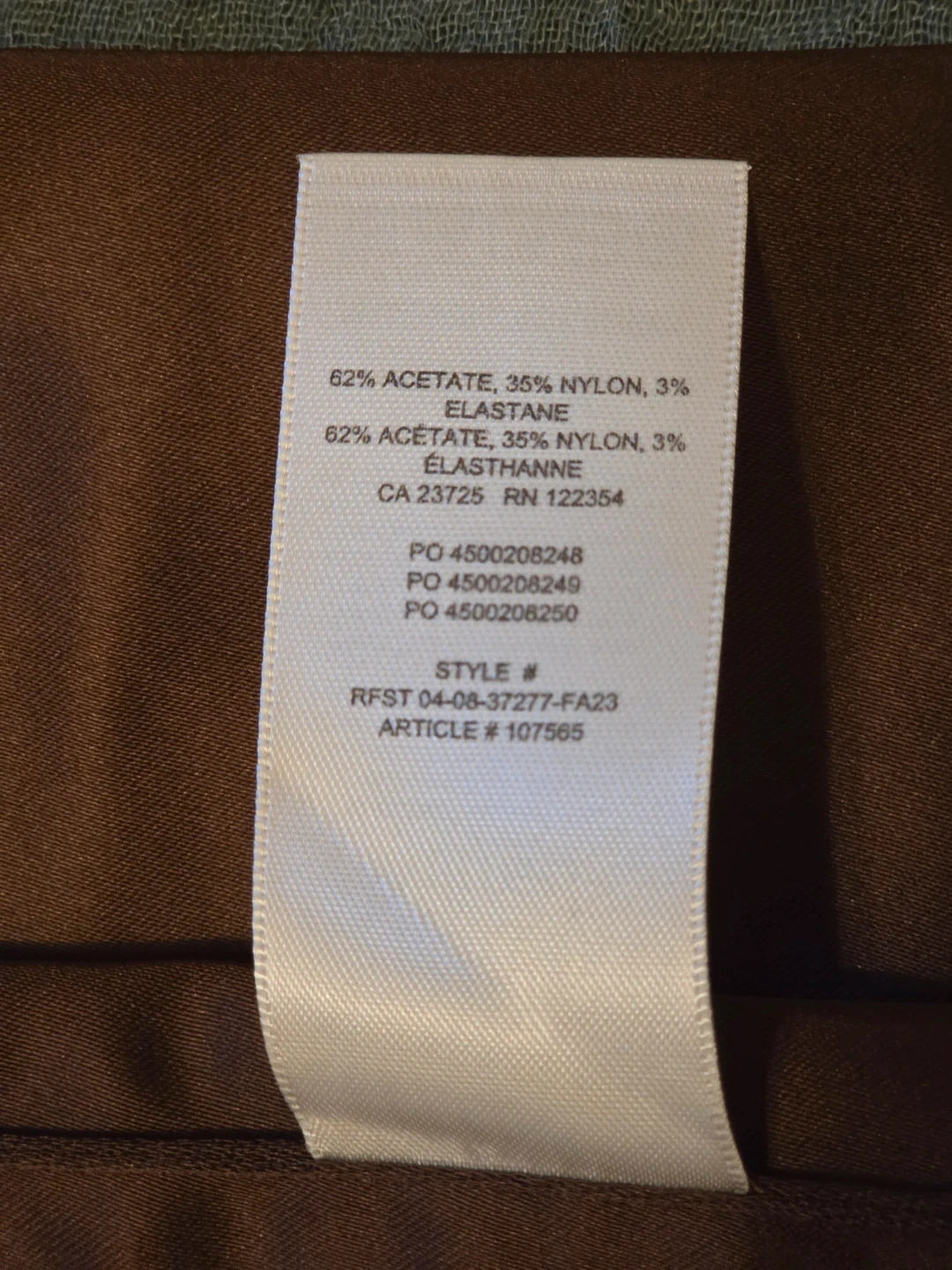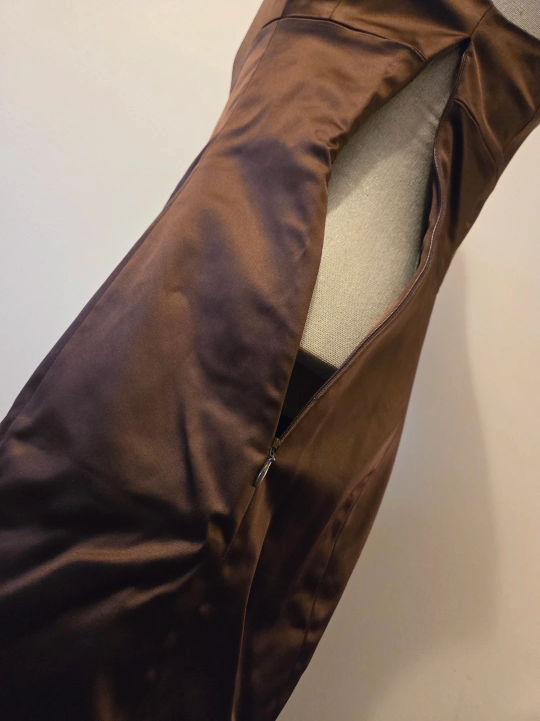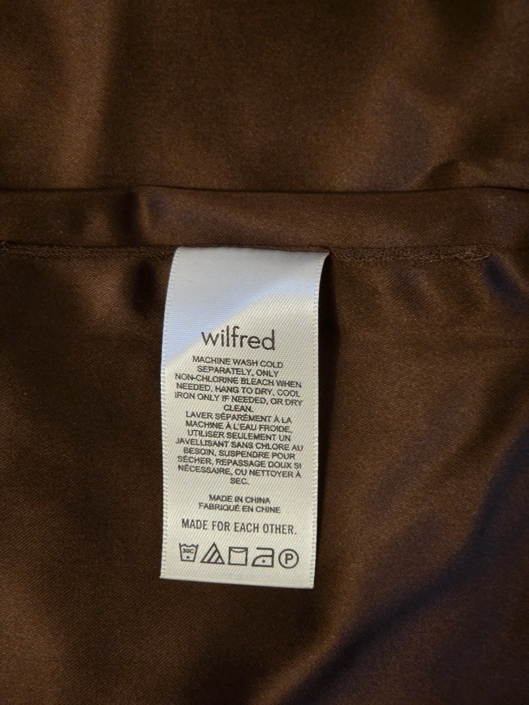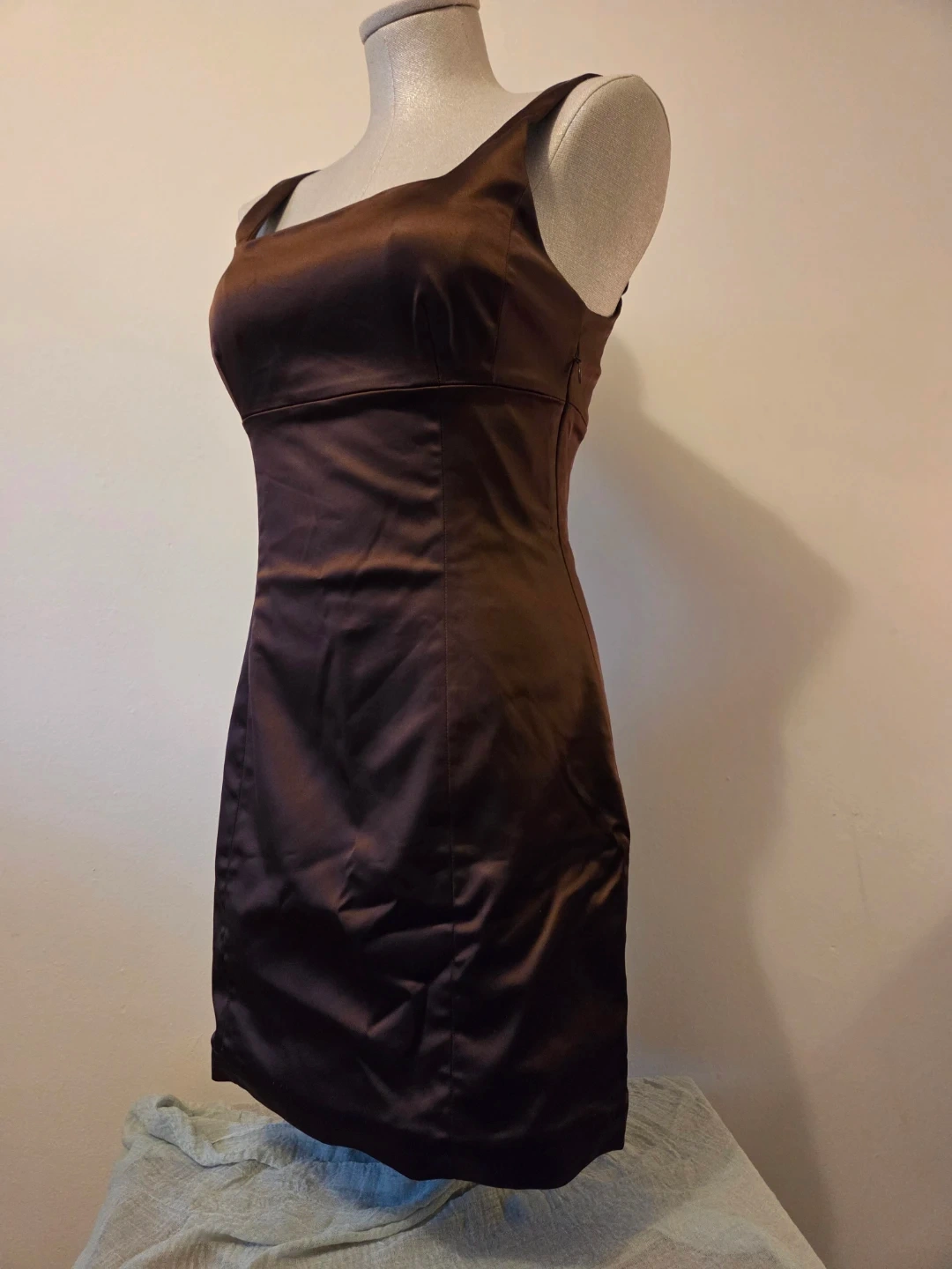 This Wilfred dress shimmers in a cocoa bean satin. It features a square neckline and side zipper. Simply flattering.