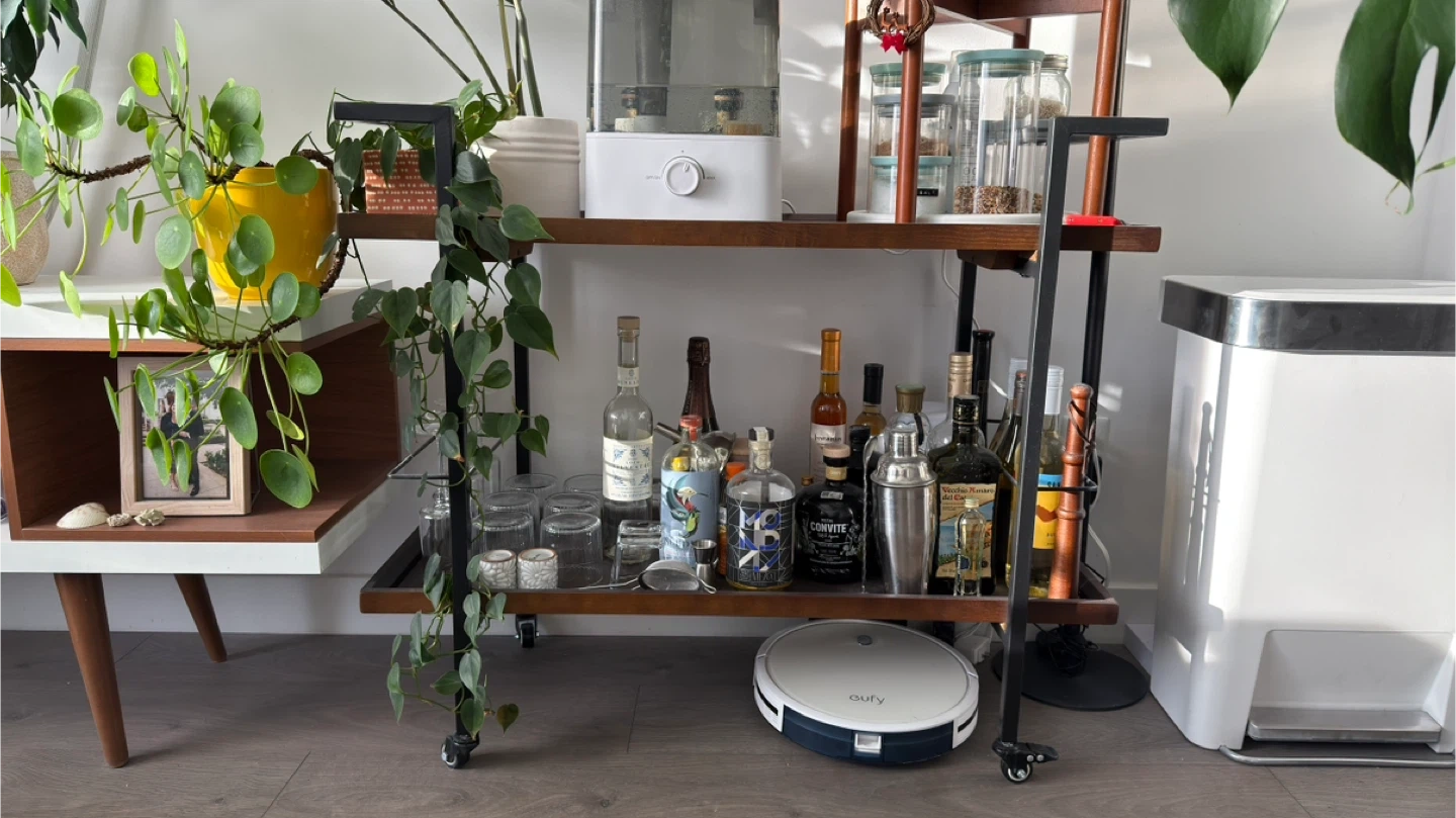 Wooden bar cart with a clean, modern look. Solid, well-balanced, and easy to move around when hosting (has wheels and lock mechanism). Great size without feeling bulky.