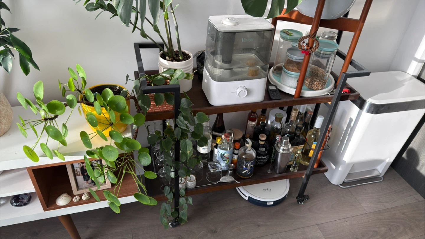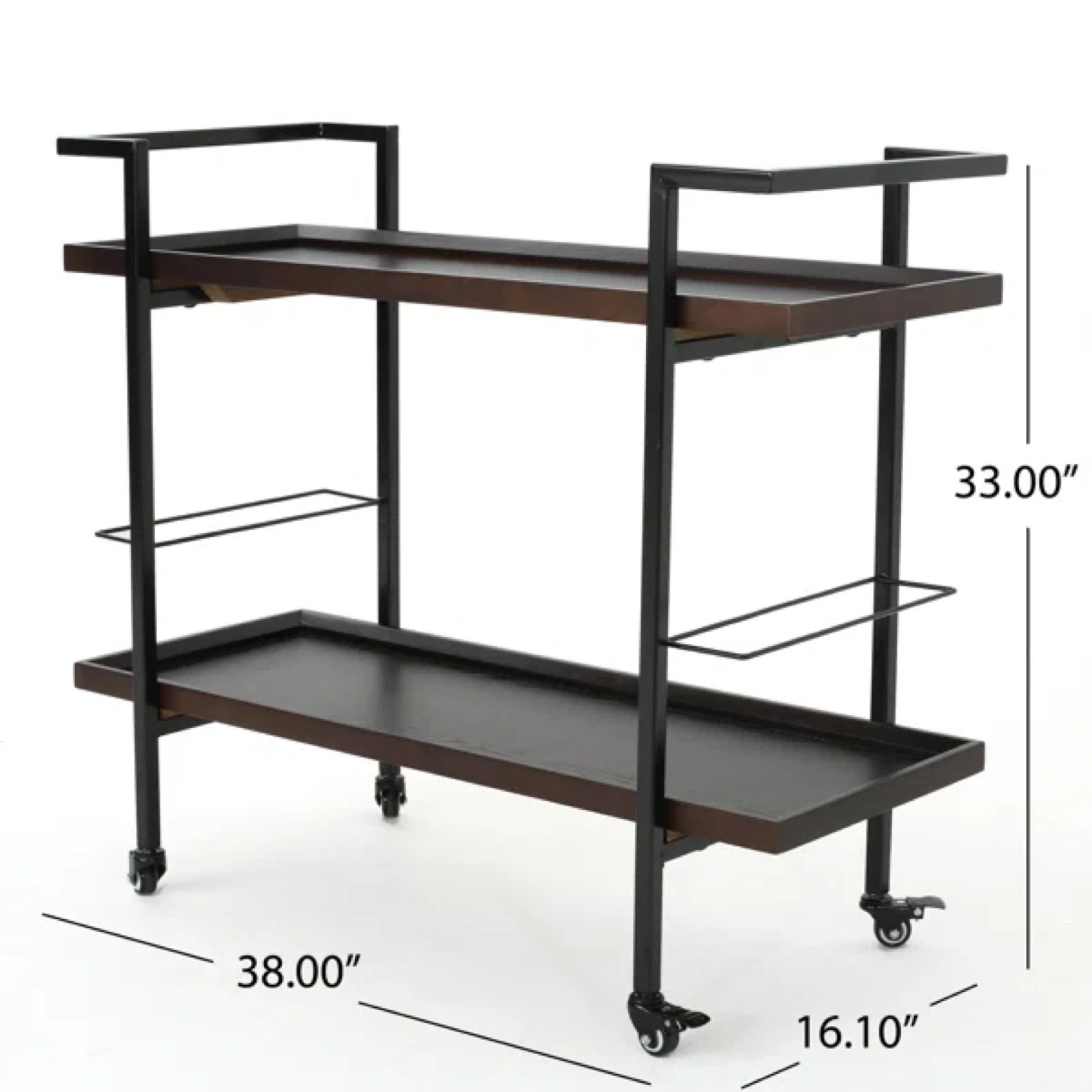 Wooden bar cart with a clean, modern look. Solid, well-balanced, and easy to move around when hosting (has wheels and lock mechanism). Great size without feeling bulky.