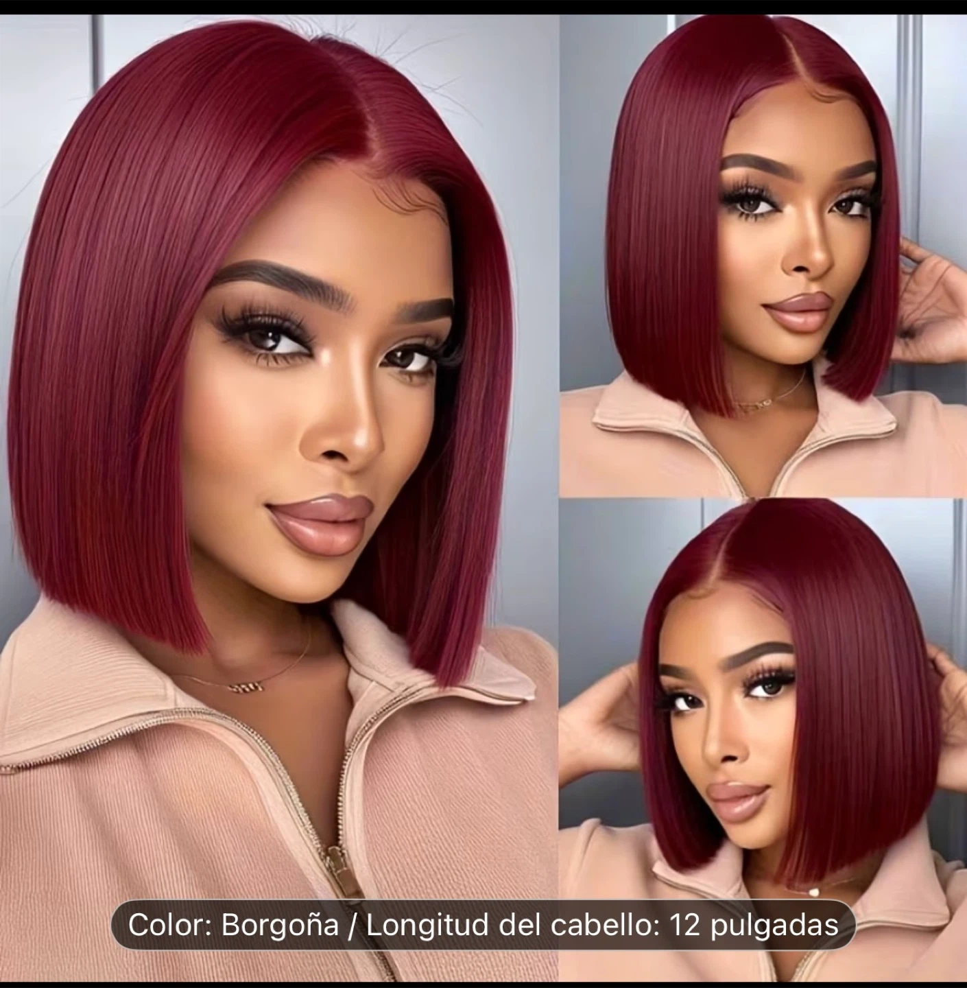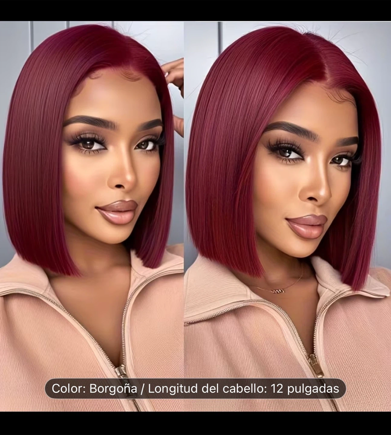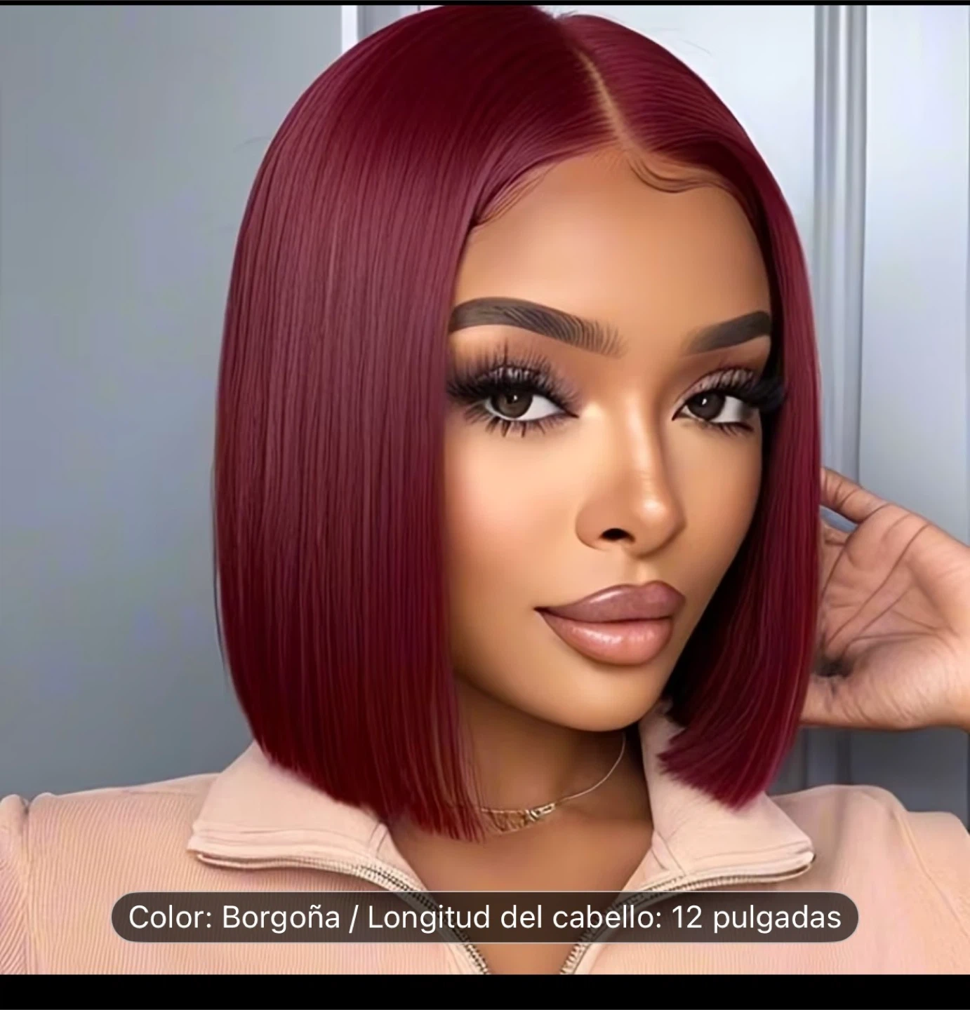 This is a burgundy bob wig. It's 12 inches long. It features an adjustable buckle and a breathable internal network for comfort. The hair is a rich burgundy color.