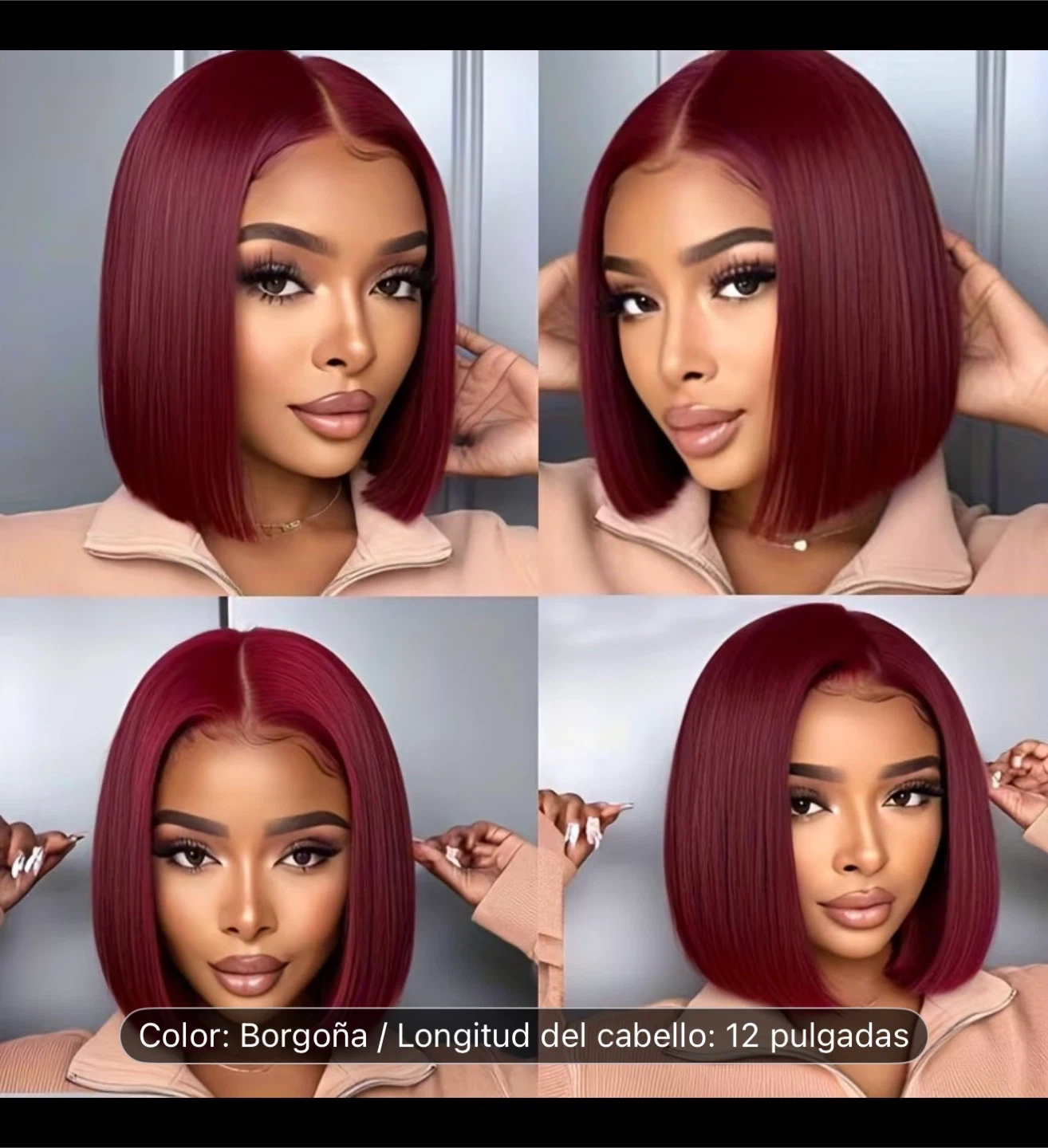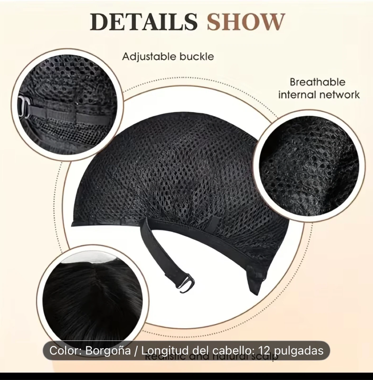 This is a burgundy bob wig. It's 12 inches long. It features an adjustable buckle and a breathable internal network for comfort. The hair is a rich burgundy color.