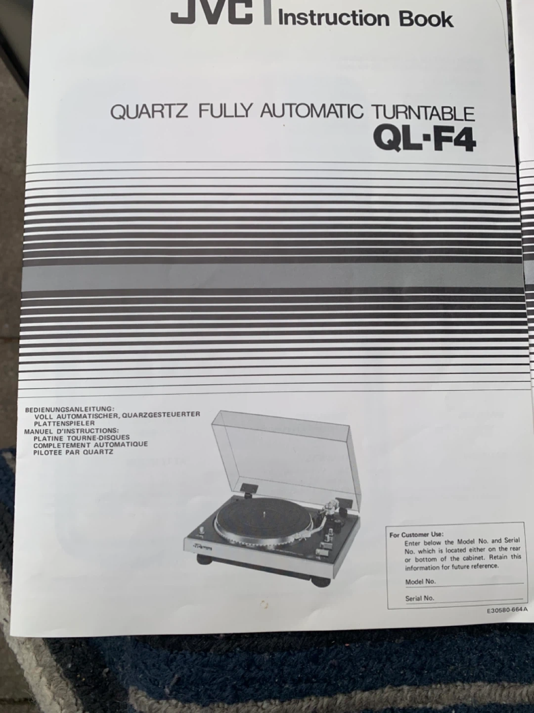 This is the JVC QL-F4 quartz fully automatic turntable. It includes operation manuals in English, German, and French. Learn how to set up and use your turntable!