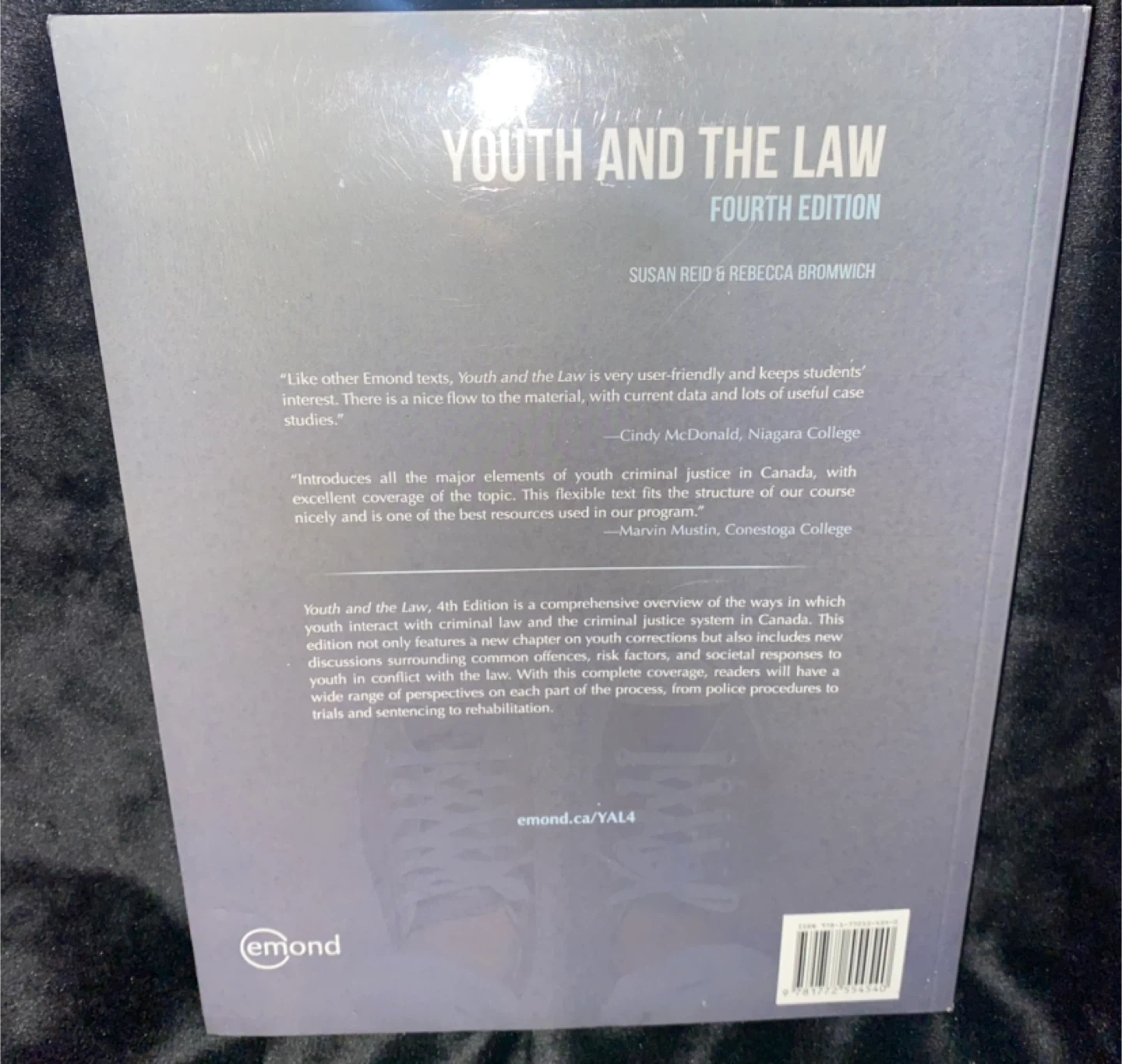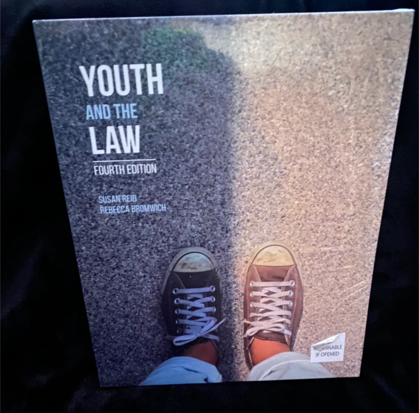 I'm offering a crisp, brand new copy of "Youth and the Law, Fourth Edition" by Susan Reid and Rebecca Bromwich! This comprehensive textbook delves into the ways in which youth interact with criminal law and the criminal justice system in Canada. It's an essential resource for students and professionals alike, providing a detailed overview of youth criminal justice from police procedures to trials and sentencing to rehabilitation.