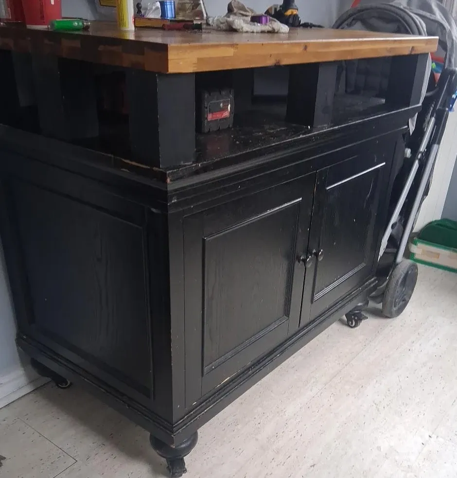 This kitchen island cart features a black base with a butcher block countertop. It has two cabinet doors for storage and sits on wheels for mobility. It's great for extra counter space and organization in the kitchen.