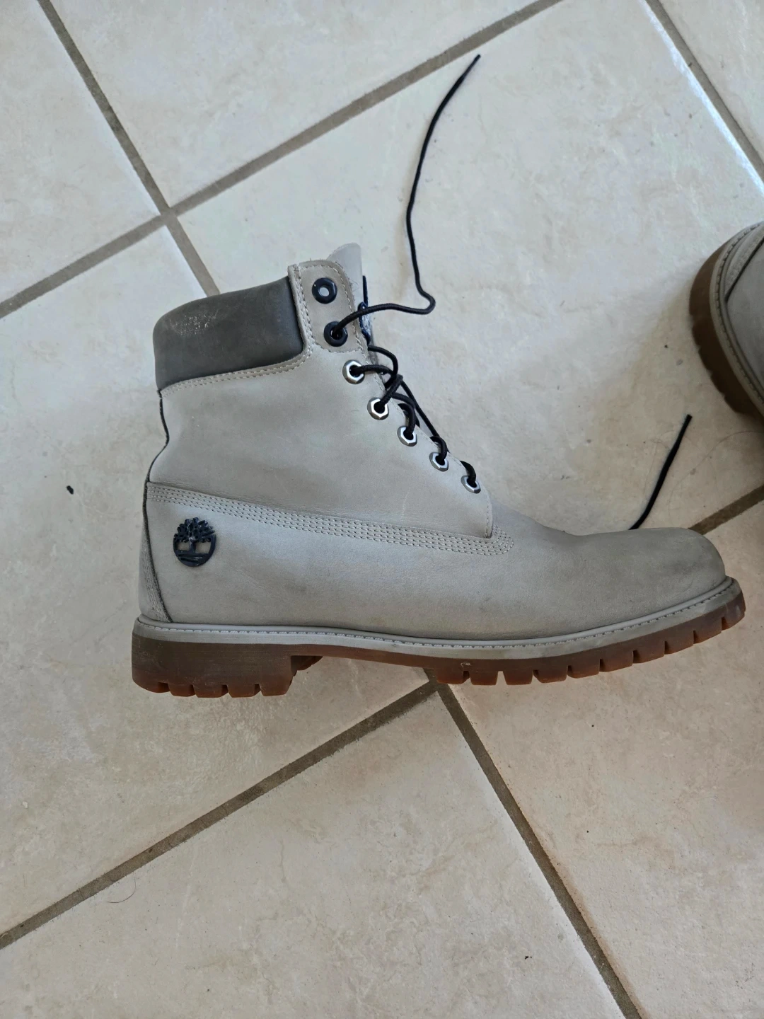Timberland boots in a light grey colour. These are sturdy and stylish footwear. They're great for casual wear or for trekking outdoors! 50th anniversary release. No longer made in this color.