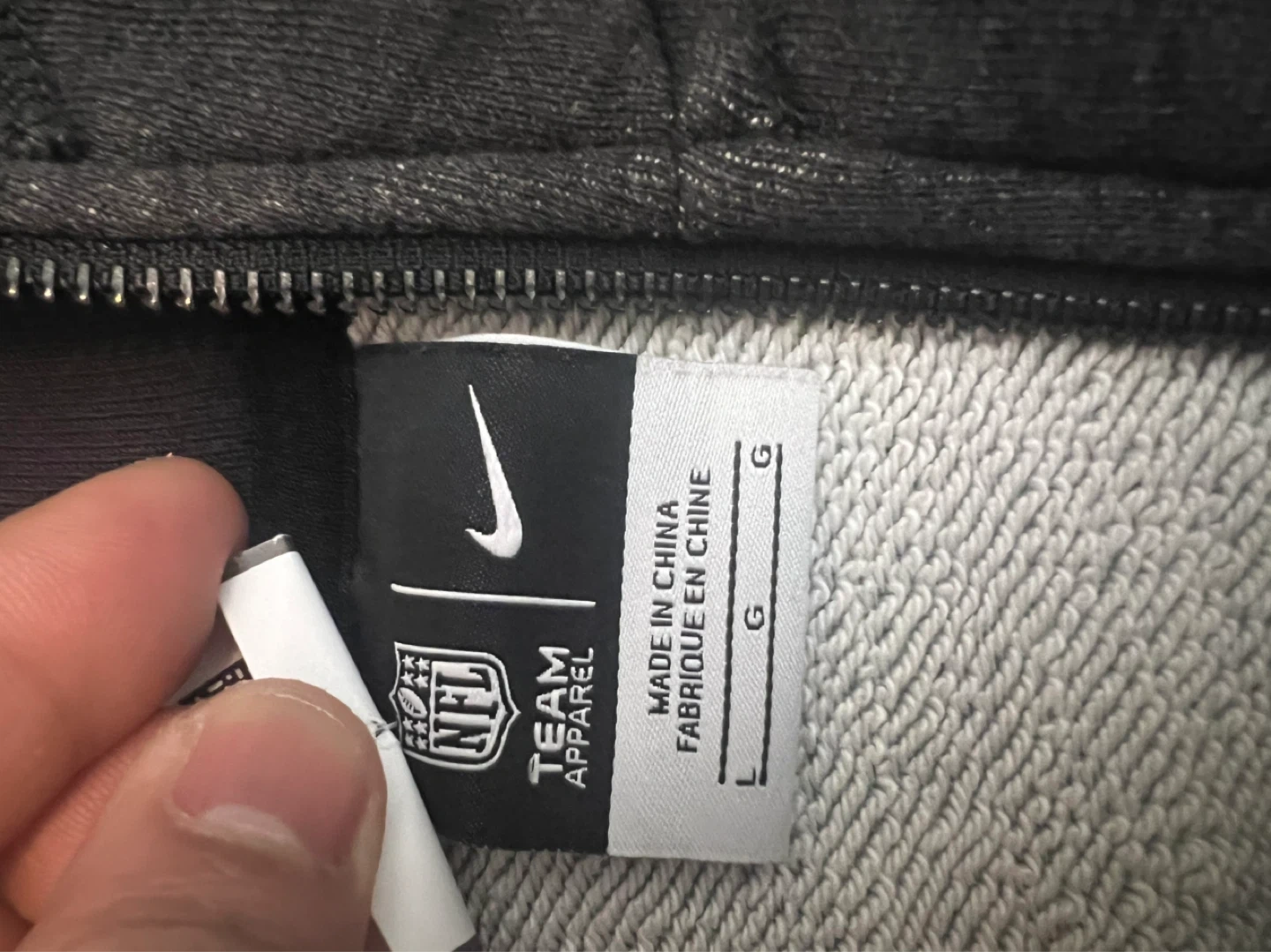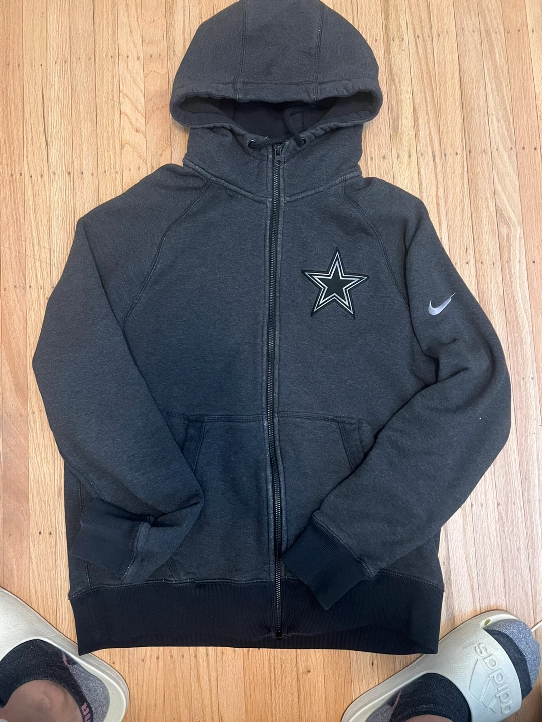 Grey Nike Team Apparel full zip hoodie. Features the Dallas Cowboys star logo and a Nike swoosh. Made in China. Size is large.