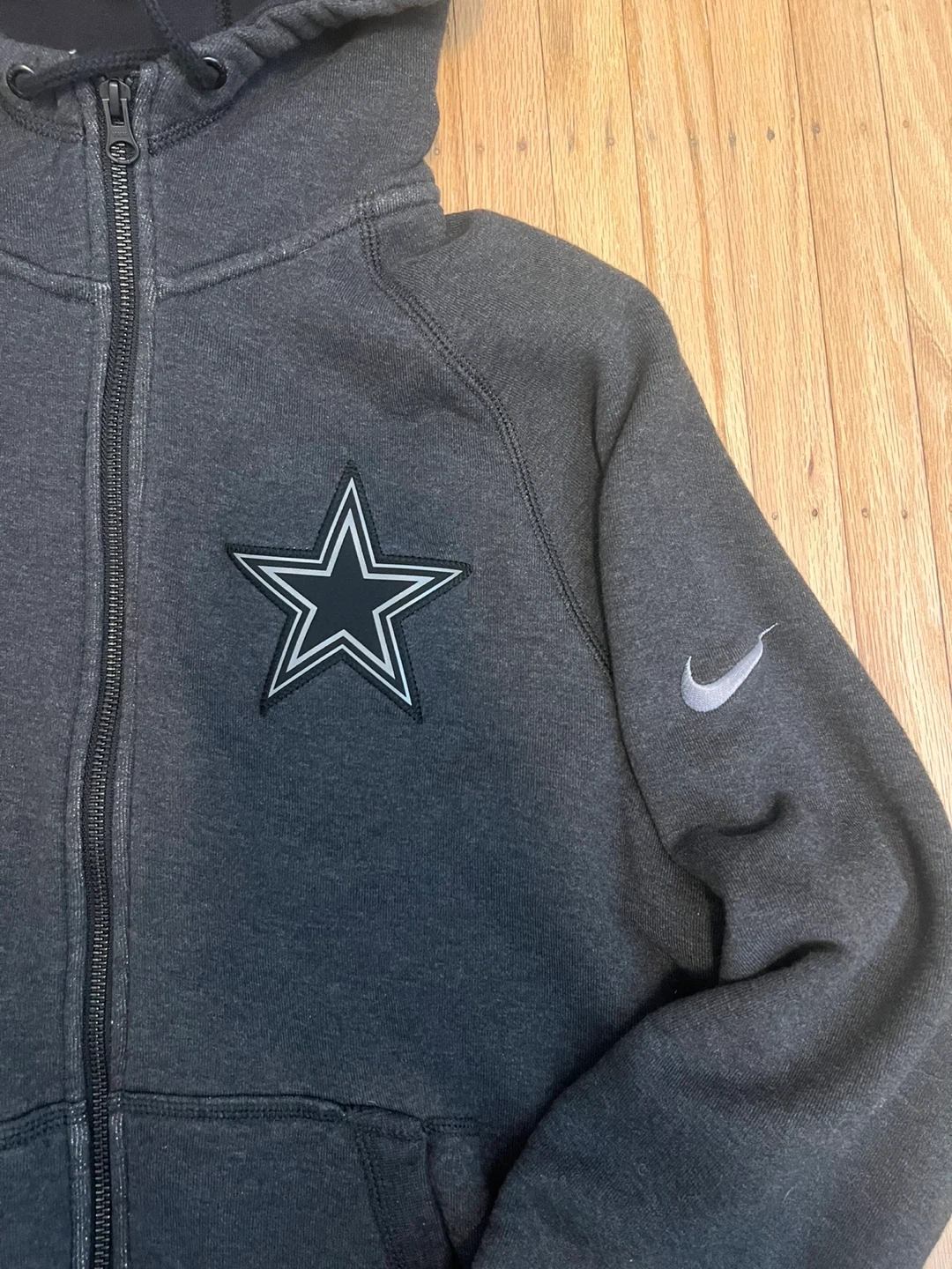 Grey Nike Team Apparel full zip hoodie. Features the Dallas Cowboys star logo and a Nike swoosh. Made in China. Size is large.