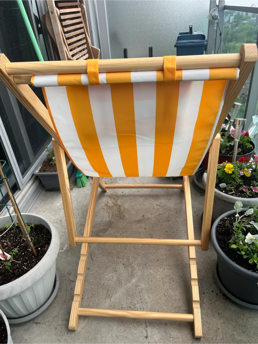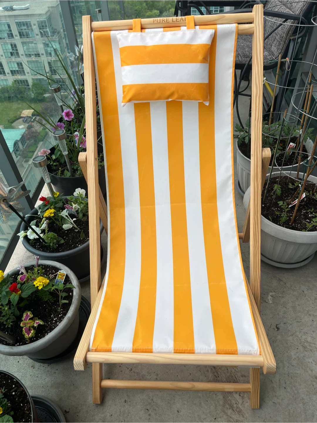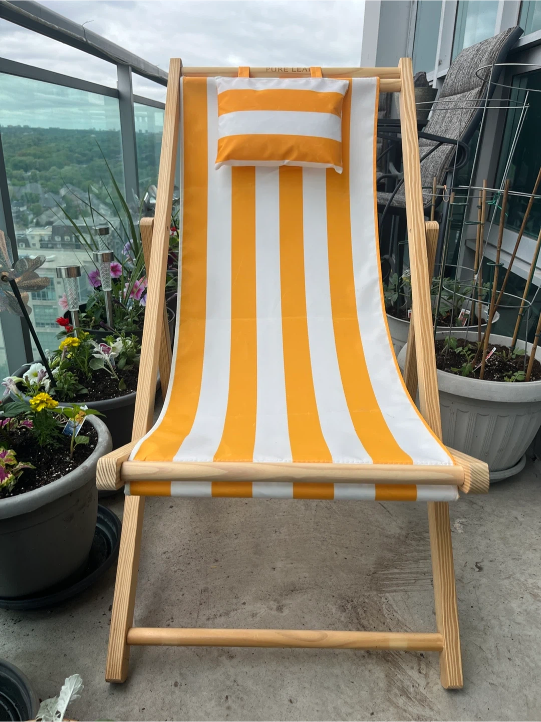 This Pure Leaf deck chair x 2 features a classic orange and white striped pattern. It comes with a matching pillow for added comfort. The wooden frame folds for easy storage.