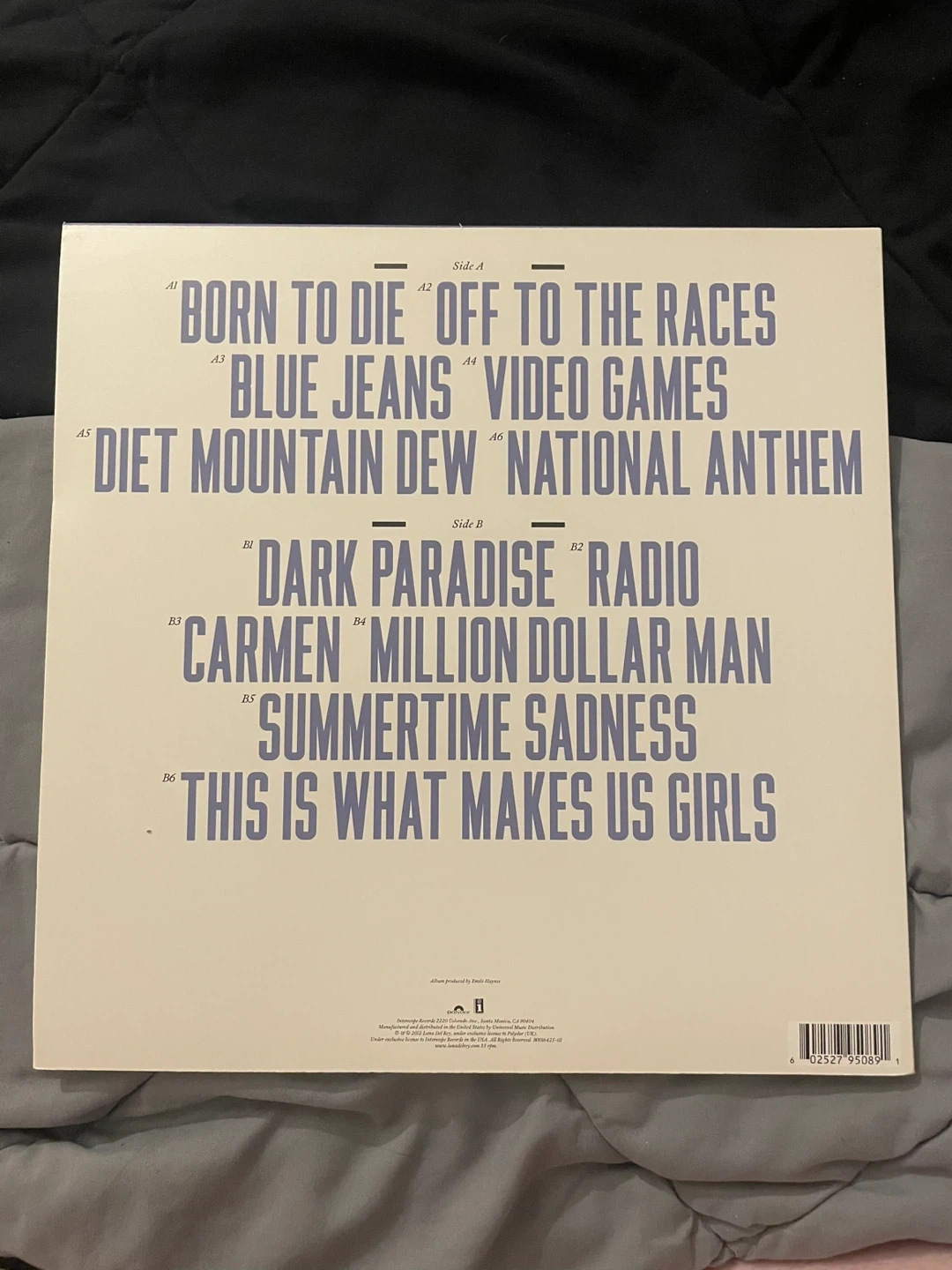 This is the vinyl record for Lana Del Rey's album "Born to Die". It features tracks like "Video Games" and "Summertime Sadness".