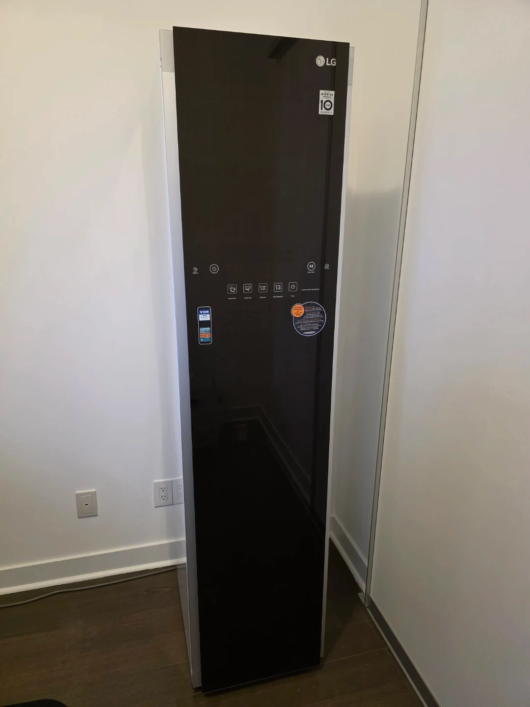 This LG Styler uses steam technology to refresh your clothes. It has a sleek black glass door and a white interior. It comes with hangers for your garments. Keep your wardrobe looking its best!