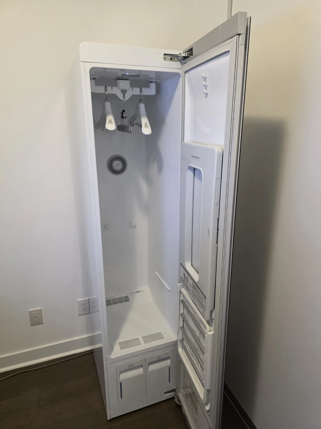 This LG Styler uses steam technology to refresh your clothes. It has a sleek black glass door and a white interior. It comes with hangers for your garments. Keep your wardrobe looking its best!