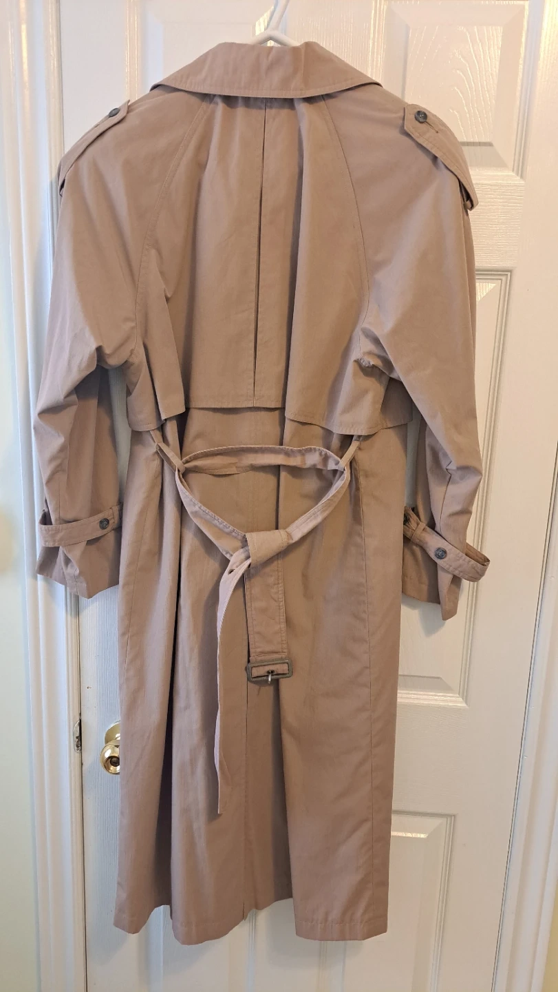 A timeless woman tan trench coat with a double-breasted closure and belted waist. It's a size medium and crafted from a durable fabric. This classic outerwear piece is great for transitional weather!