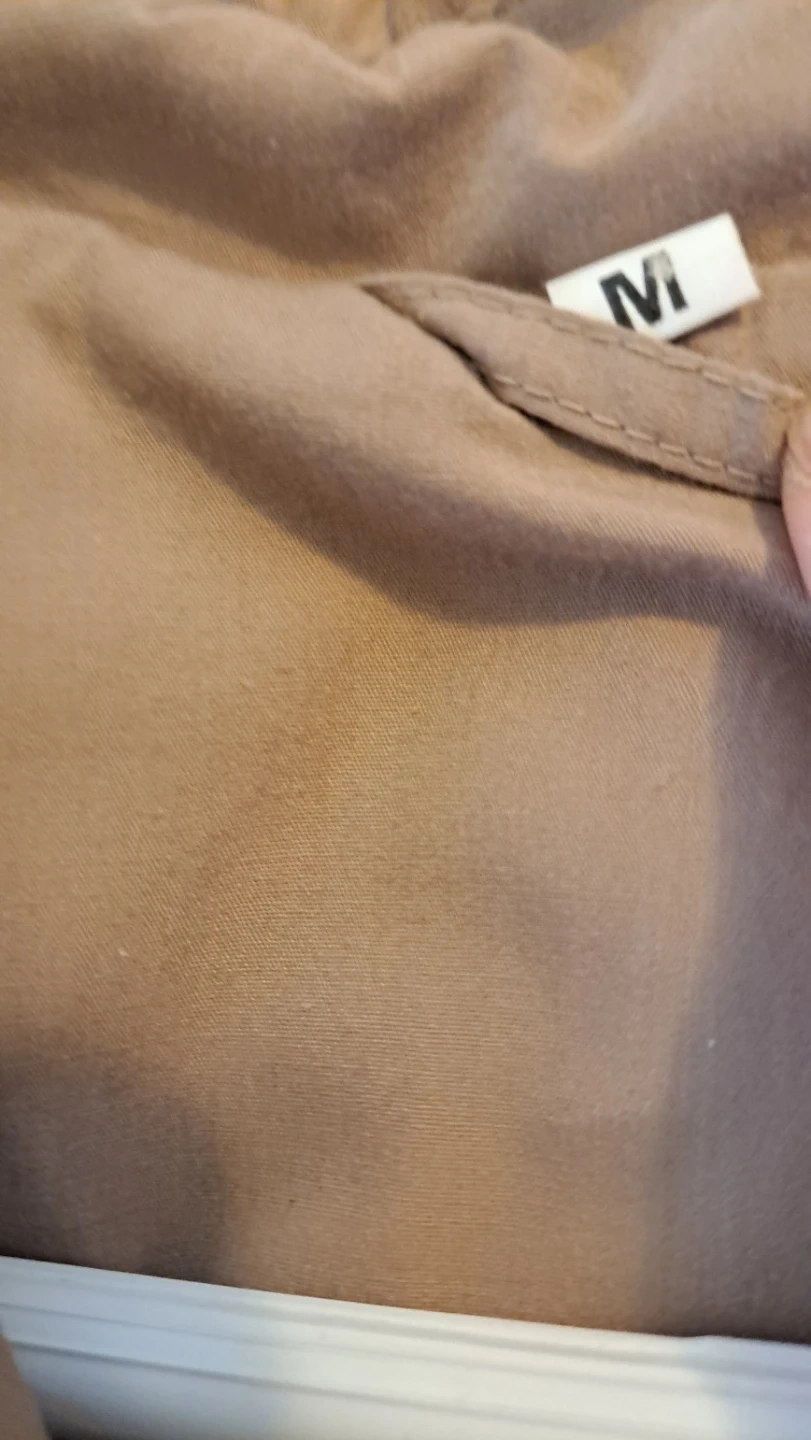 A timeless woman tan trench coat with a double-breasted closure and belted waist. It's a size medium and crafted from a durable fabric. This classic outerwear piece is great for transitional weather!