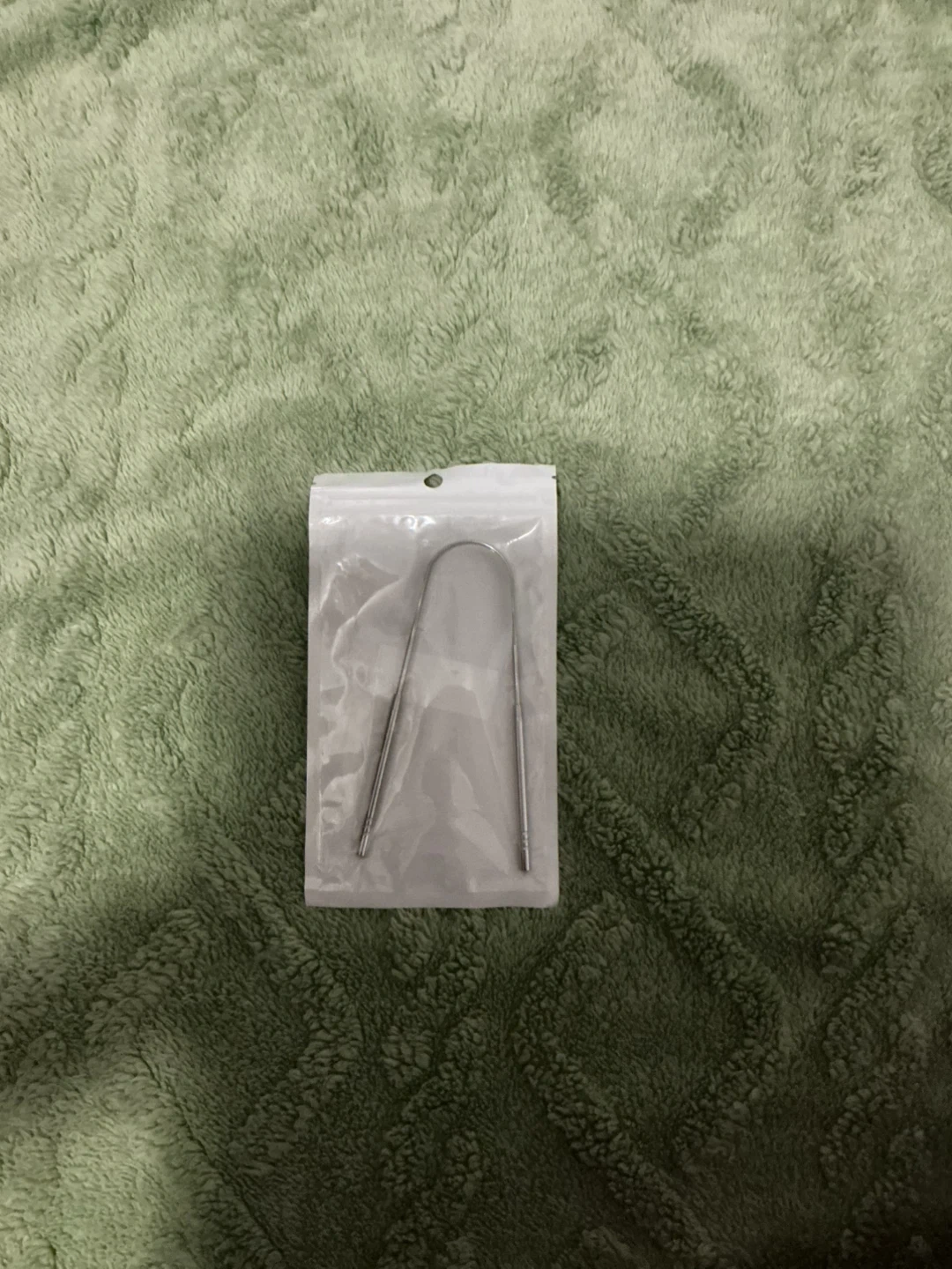 This U-shaped tongue scraper is made of stainless steel. It's designed to help clean your tongue effectively. It comes packaged in a clear plastic sleeve. Unopened and unused.