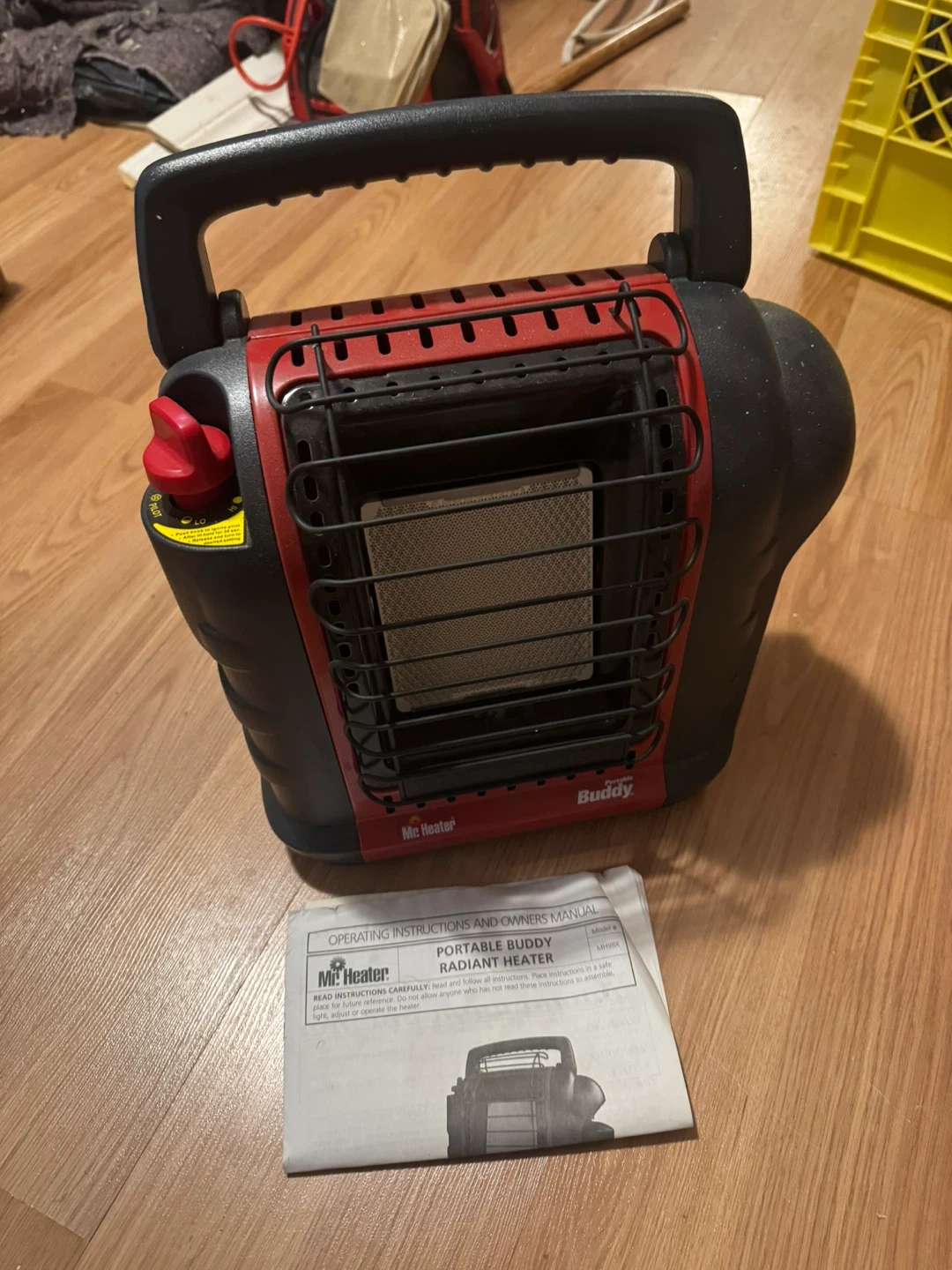 This Mr. Heater Buddy portable radiant heater is designed for personal heating needs. It includes safety features like a low-oxygen shut-off sensor and an emergency pilot system. An operating manual is also included.