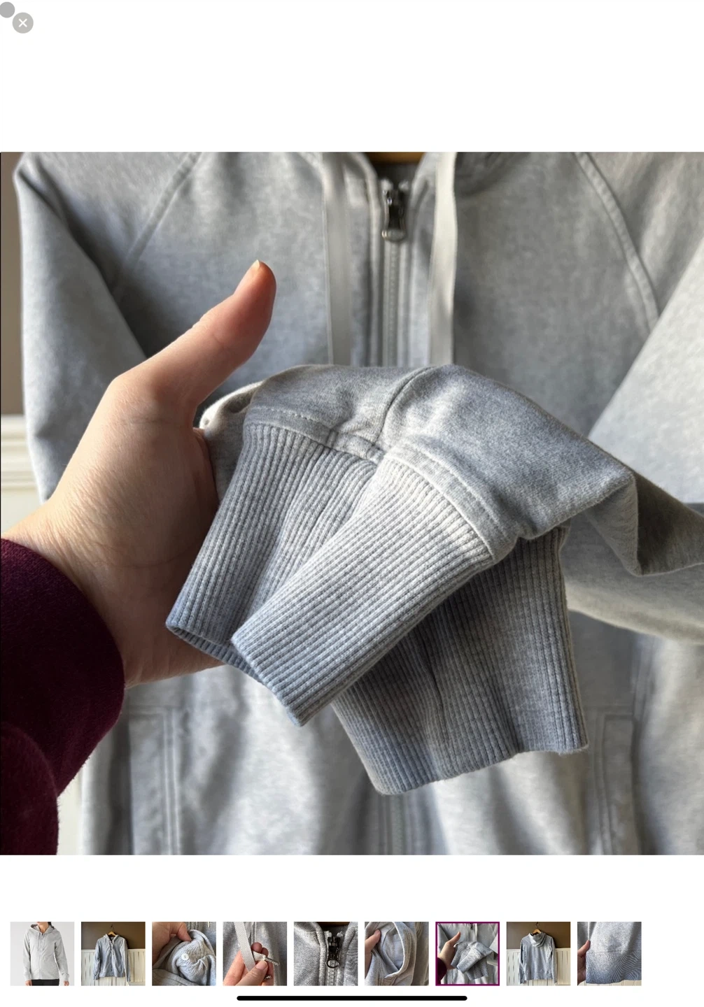 This is a Lululemon zip-up hoodie in a light grey colour. It's a size 8 with a full zipper closure and pockets. It's made from a comfortable fabric, perfect for casual wear or light workouts.