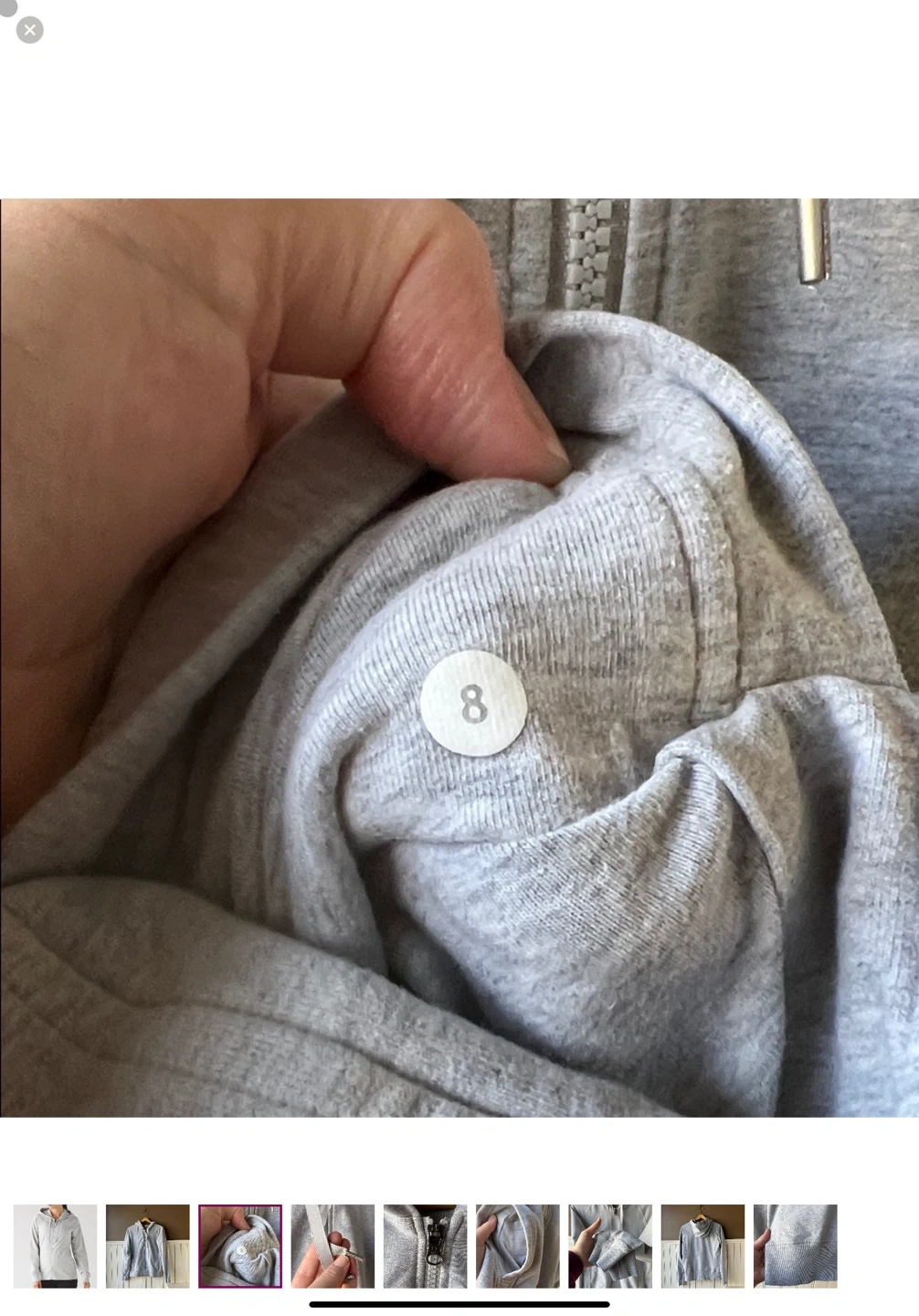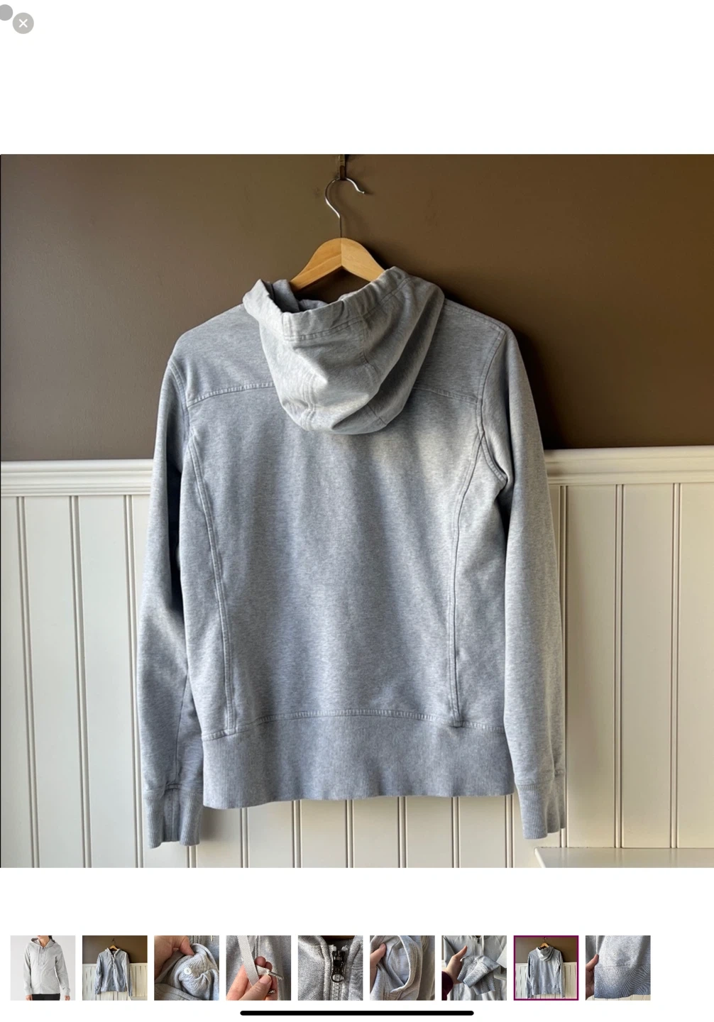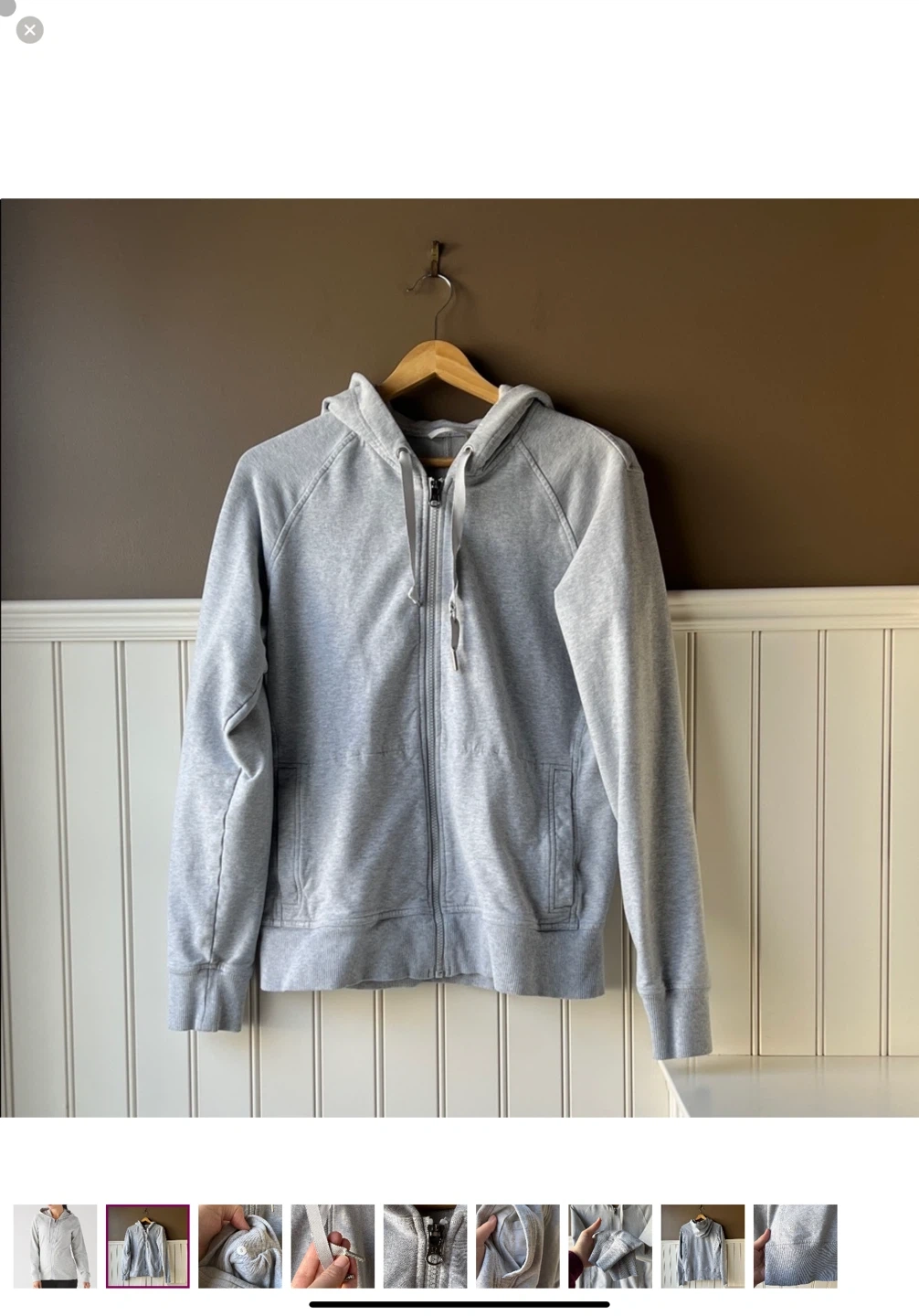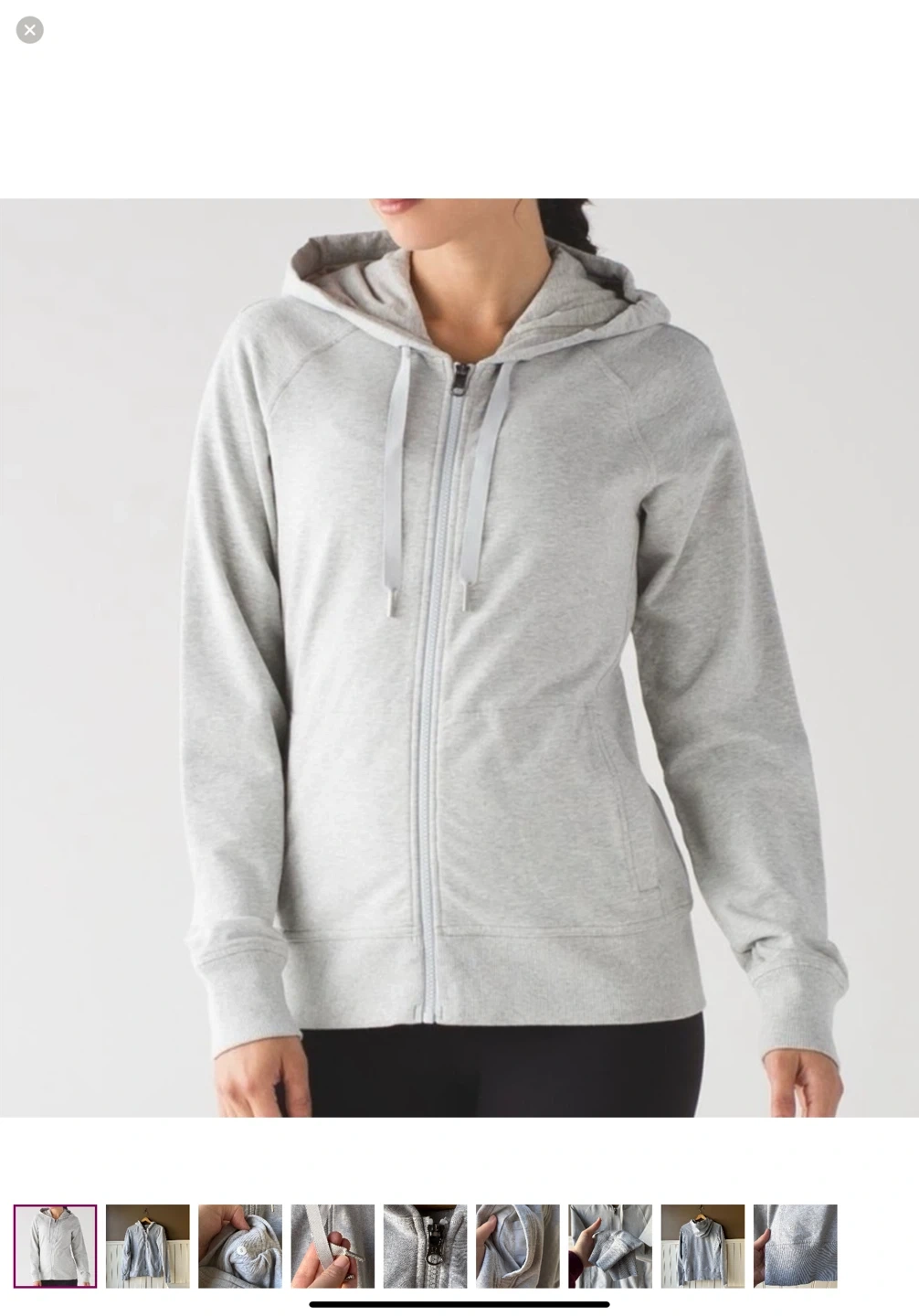 This is a Lululemon zip-up hoodie in a light grey colour. It's a size 8 with a full zipper closure and pockets. It's made from a comfortable fabric, perfect for casual wear or light workouts.