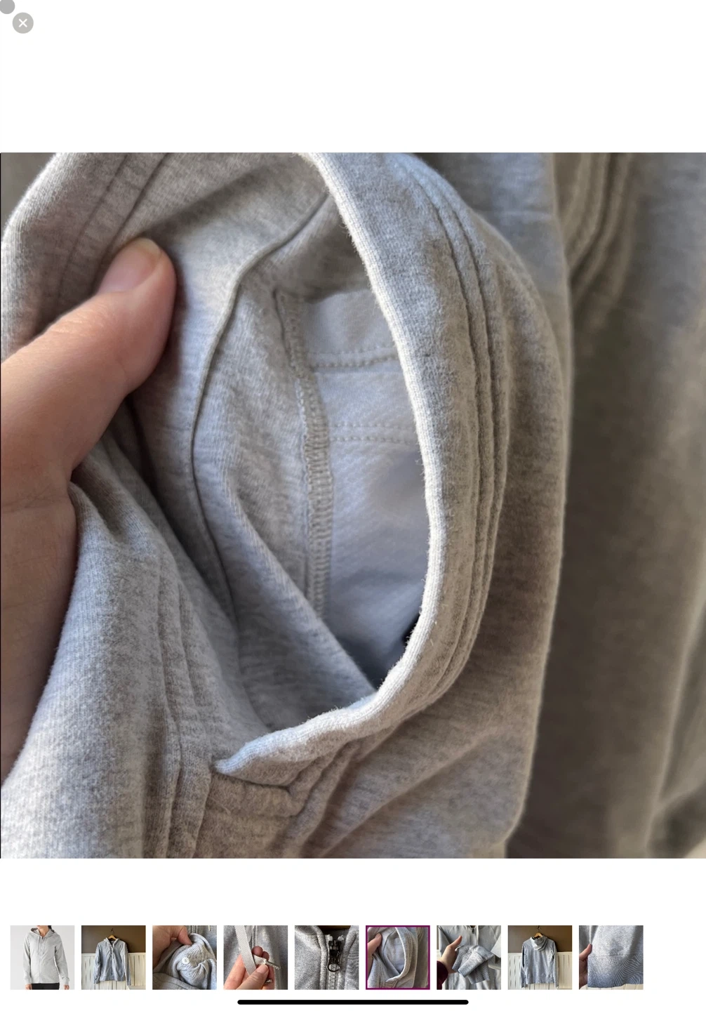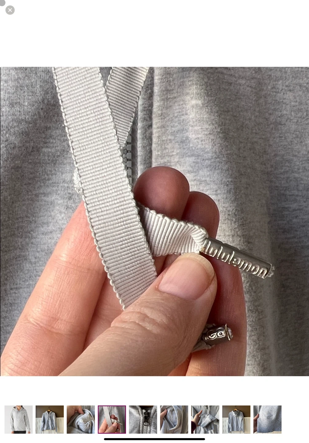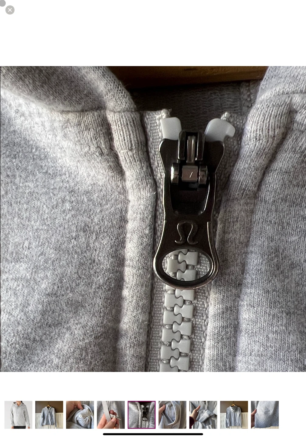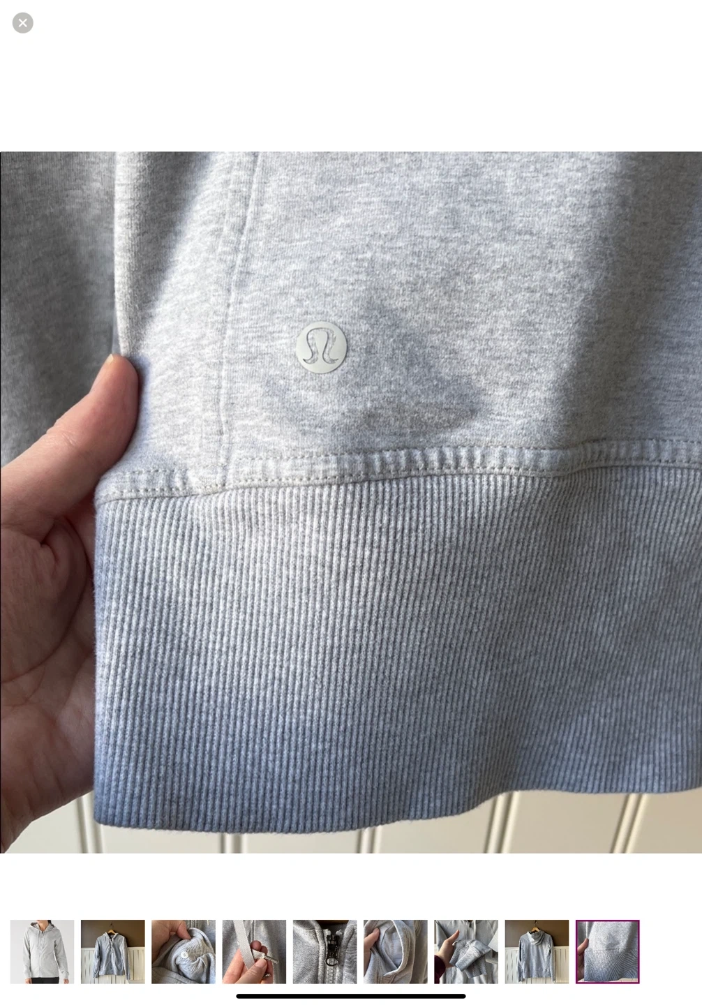 This is a Lululemon zip-up hoodie in a light grey colour. It's a size 8 with a full zipper closure and pockets. It's made from a comfortable fabric, perfect for casual wear or light workouts.