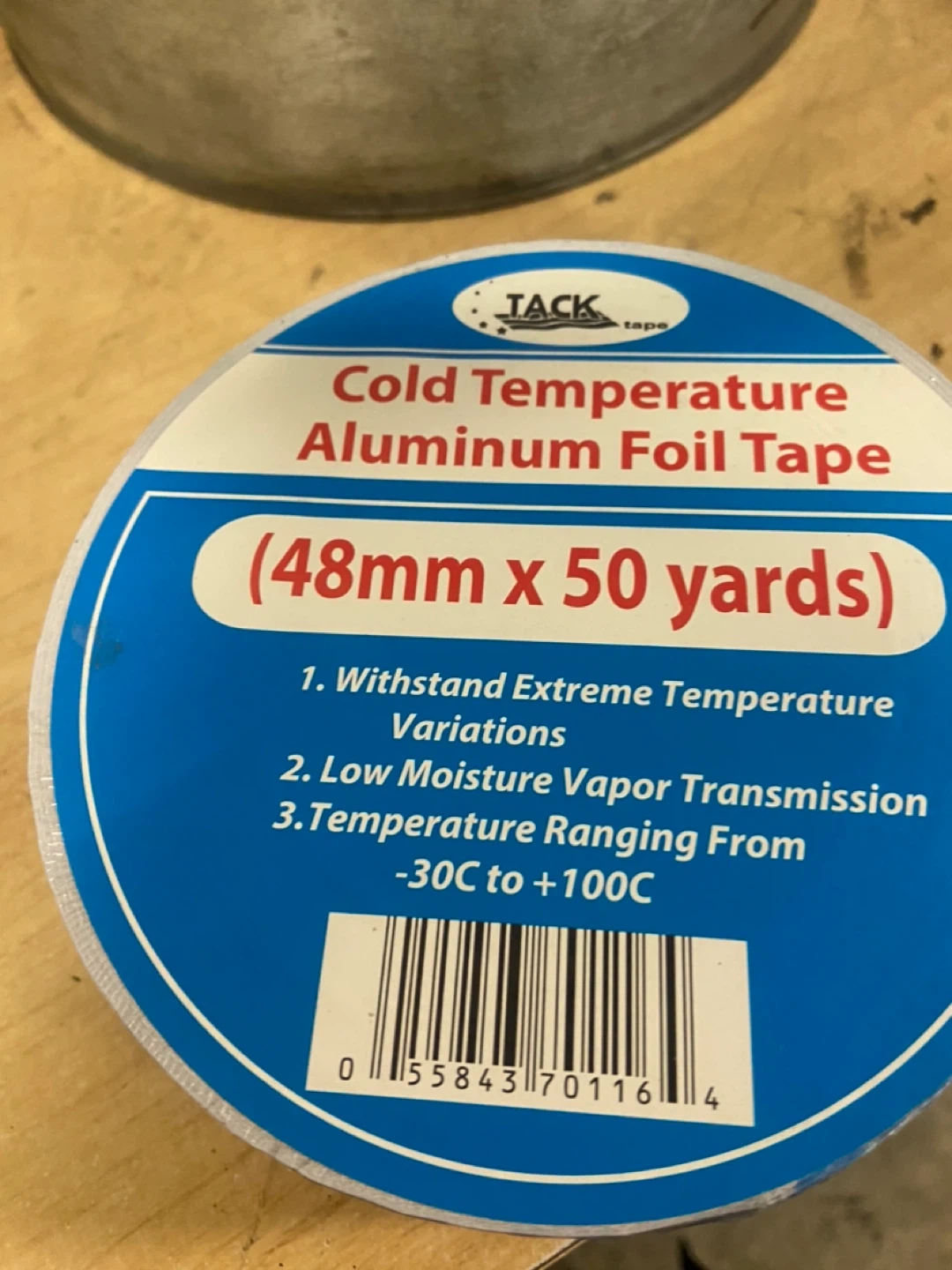 Multi use TACK brand cold temperature aluminum foil tape. It's 48mm wide and 50 yards long. It withstands extreme temperature variations and has low moisture vapor transmission, -30 C to +100C temperature range.