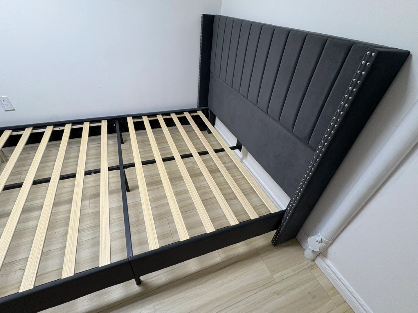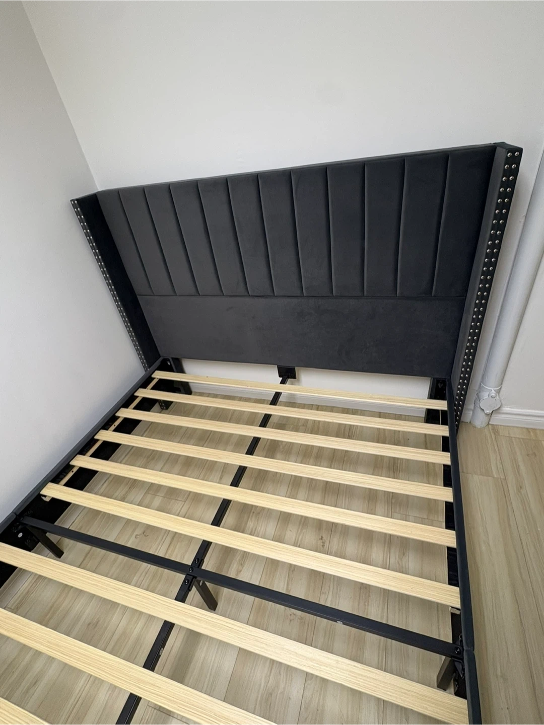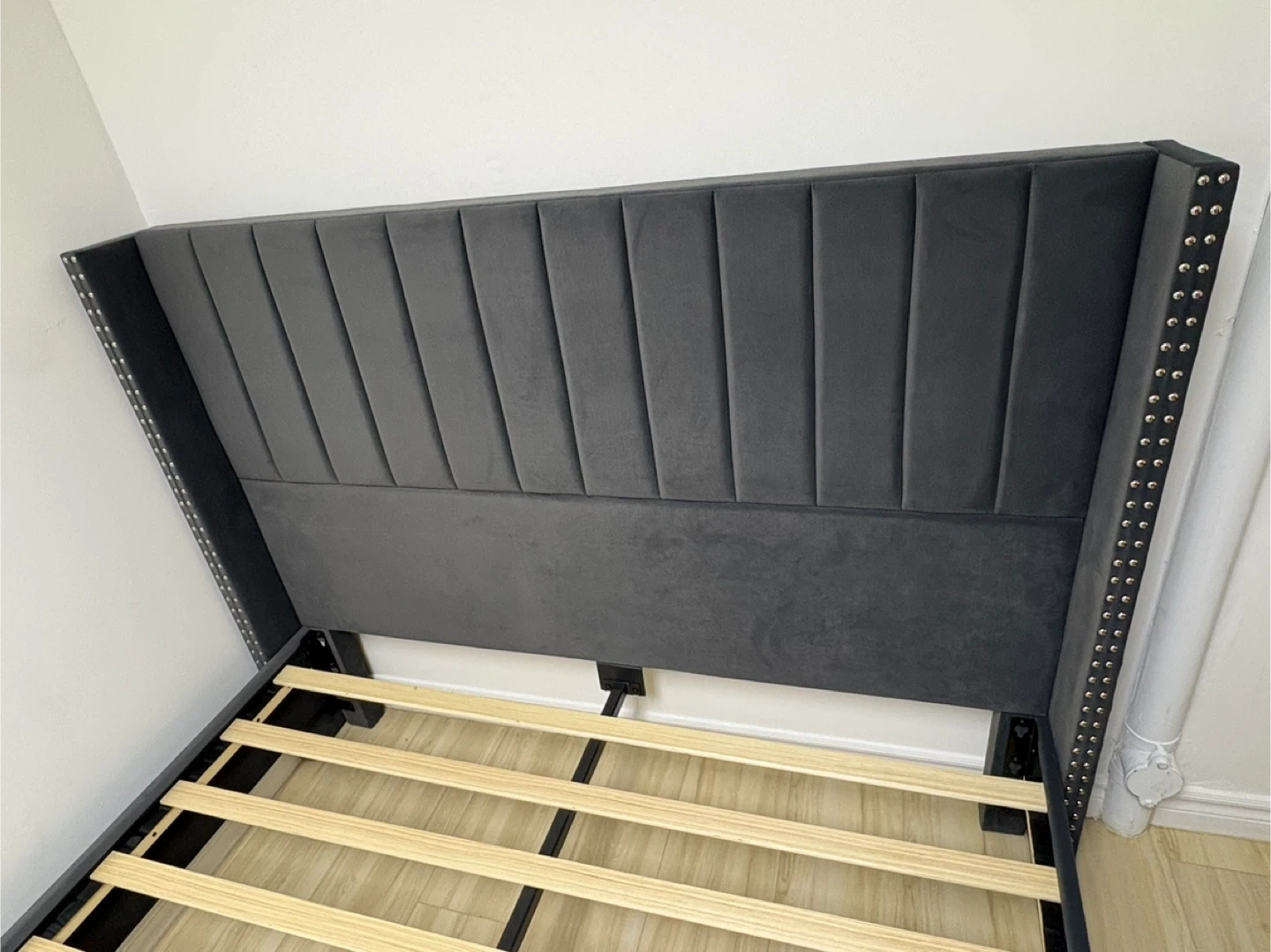 This wingback bed frame is upholstered in dark grey velvet and features decorative studs along the edges. It includes a wooden slat support system for your mattress. It's a stylish addition to any bedroom! NEW