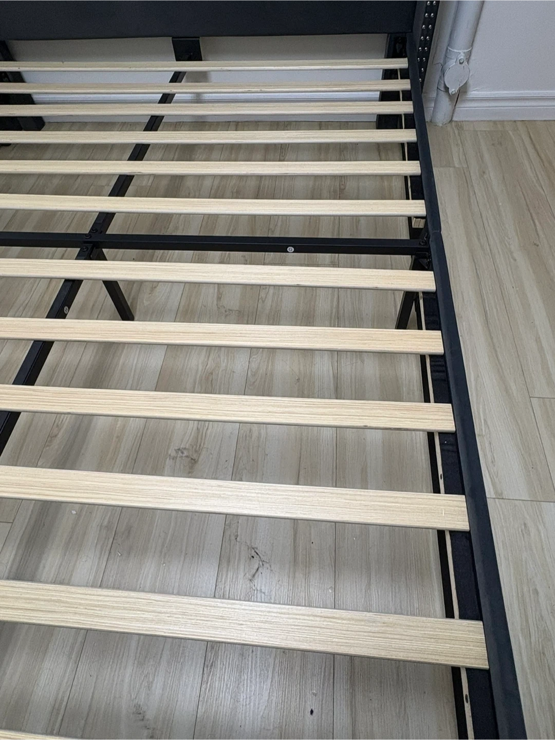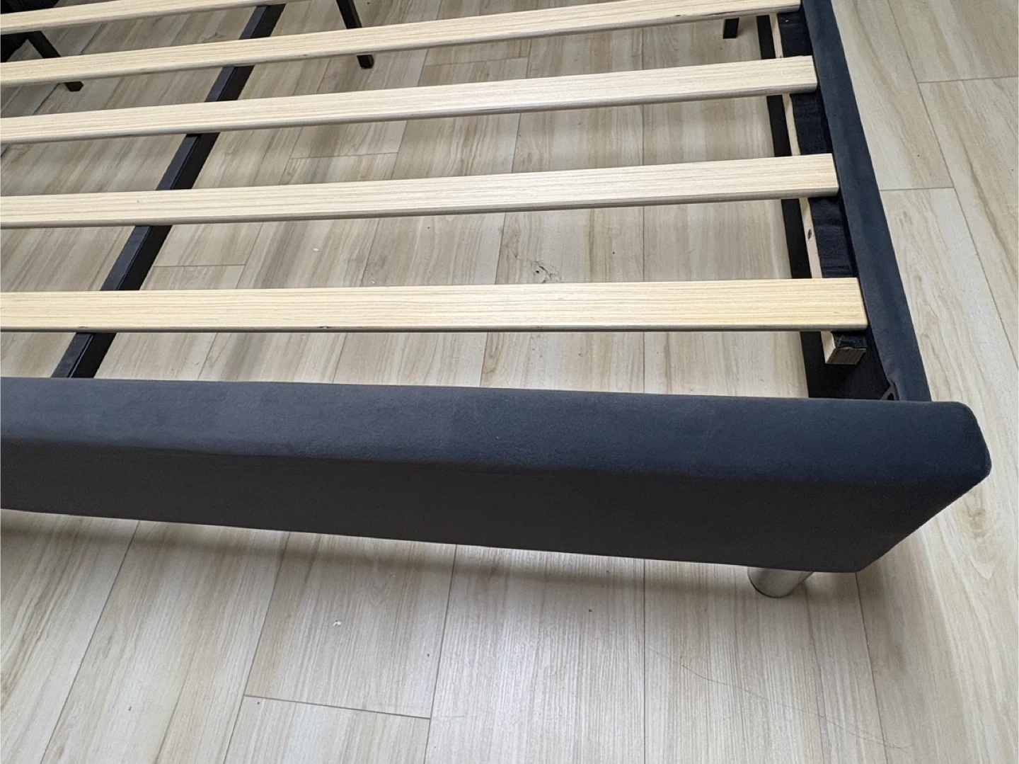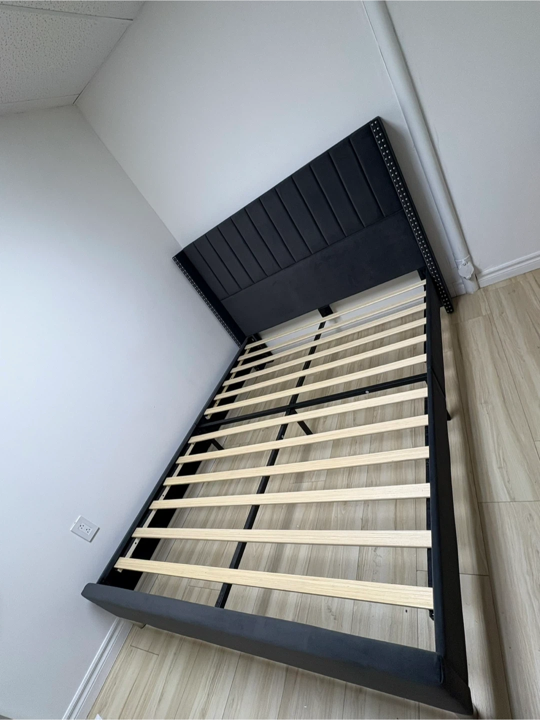 This wingback bed frame is upholstered in dark grey velvet and features decorative studs along the edges. It includes a wooden slat support system for your mattress. It's a stylish addition to any bedroom! NEW