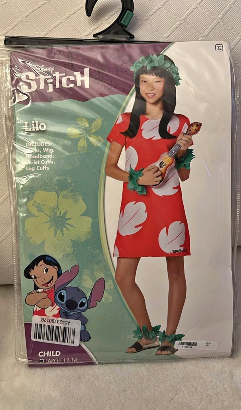 Selling a brand new Disney Stitch Lilo costume for kids! This is a size Large, suitable for children aged 12-14. The costume includes the dress, wig, headband, wrist cuffs, and leg cuffs. Perfect for Halloween or dress-up!