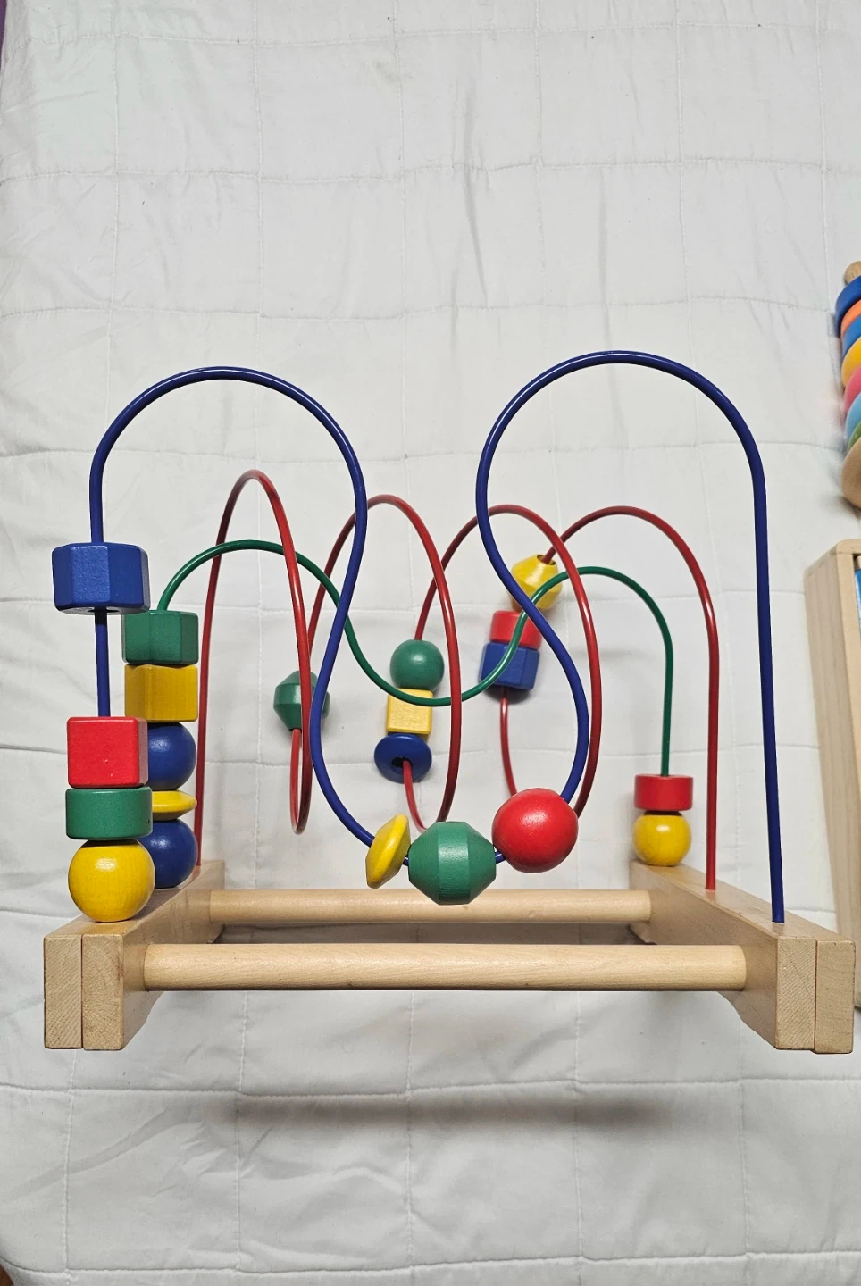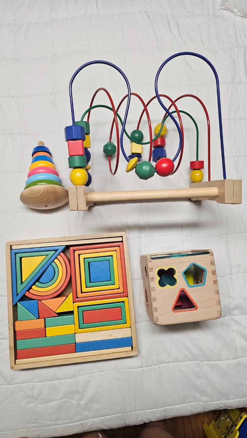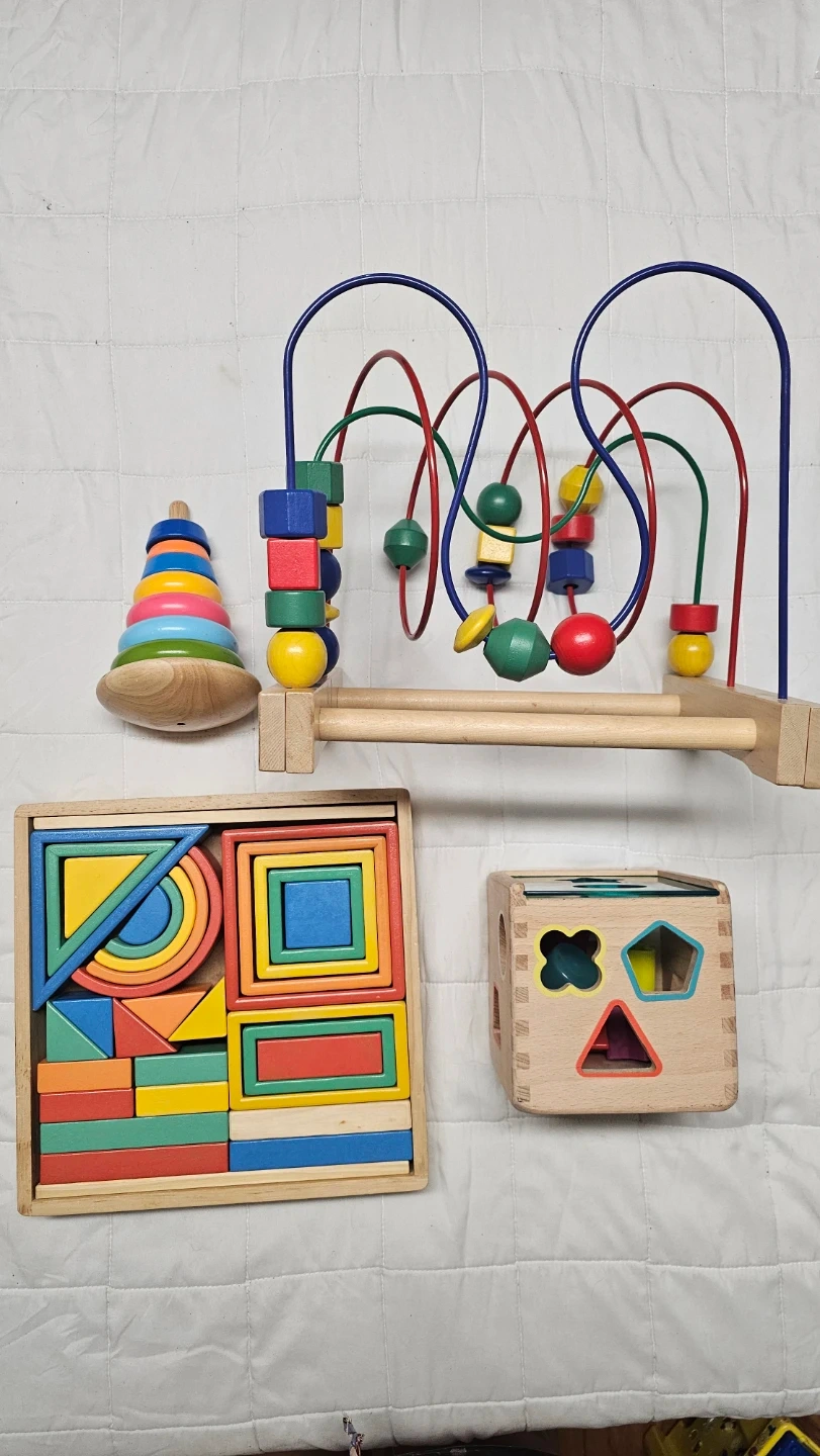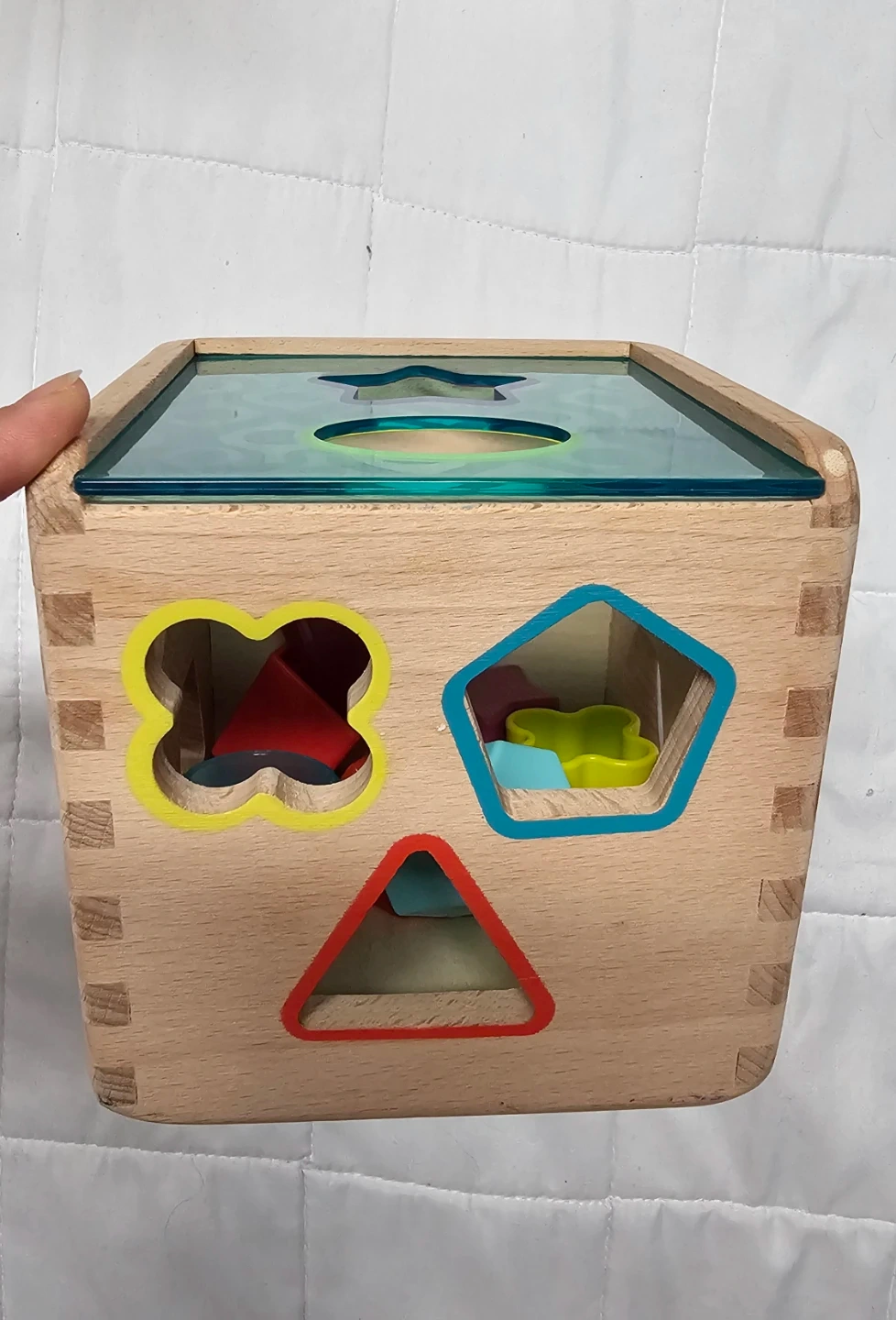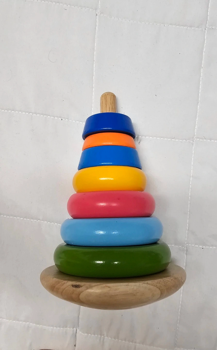 This wooden toy set includes a shape sorter cube and a colorful stacking ring toy. It's great for developing fine motor skills and colour recognition. All pieces are made from durable wood.