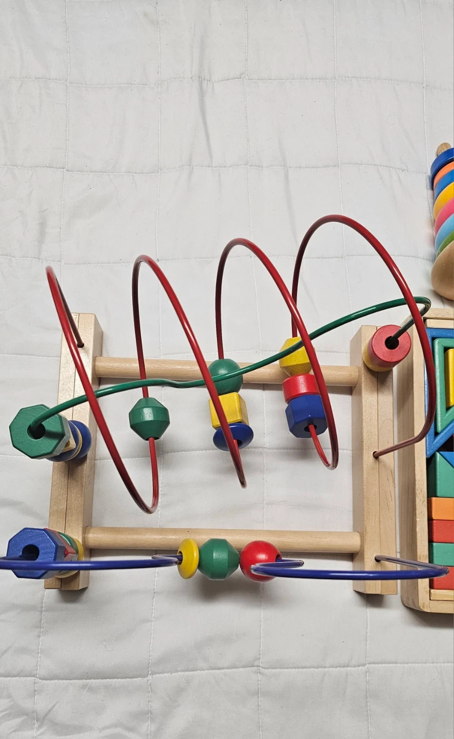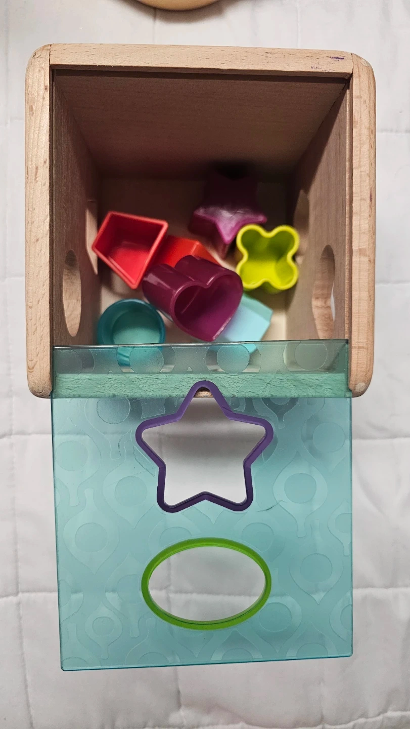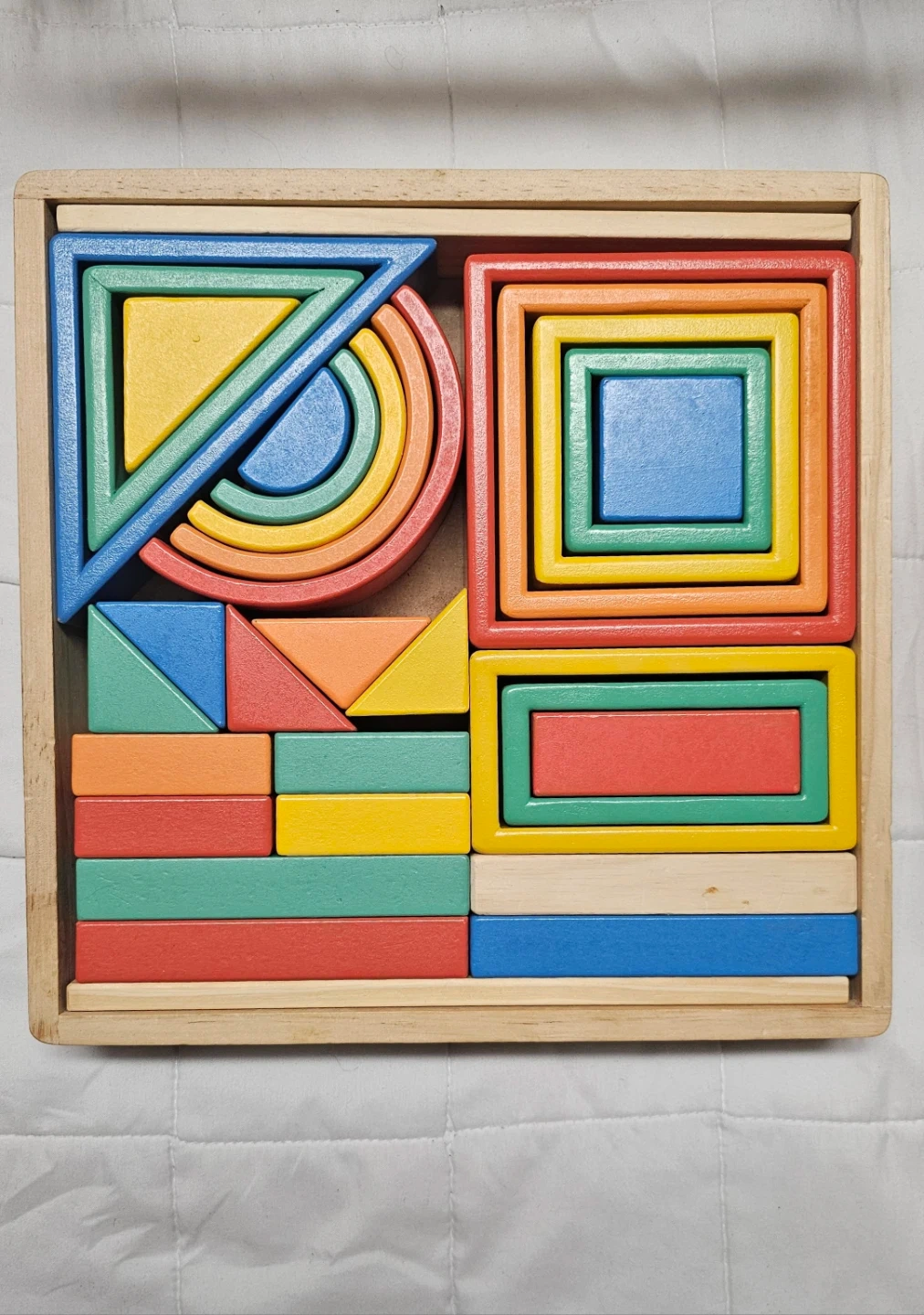 This wooden toy set includes a shape sorter cube and a colorful stacking ring toy. It's great for developing fine motor skills and colour recognition. All pieces are made from durable wood.