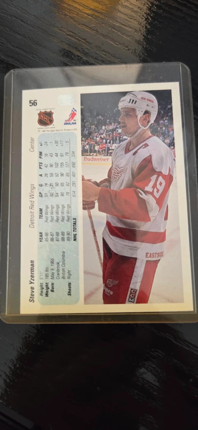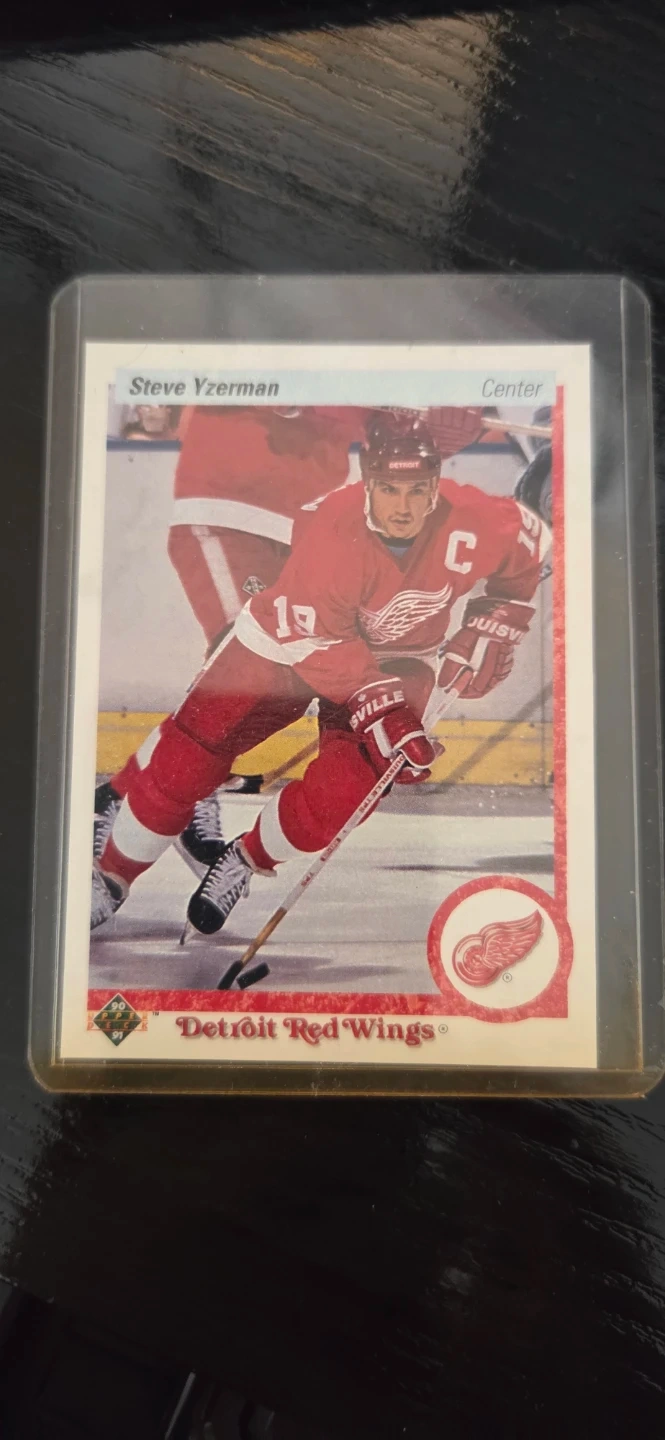 This is a 1990 Upper Deck hockey card featuring Steve Yzerman of the Detroit Red Wings. It includes his player stats from the 1989-90 season. Card measures approximately 2.5" x 3.5".