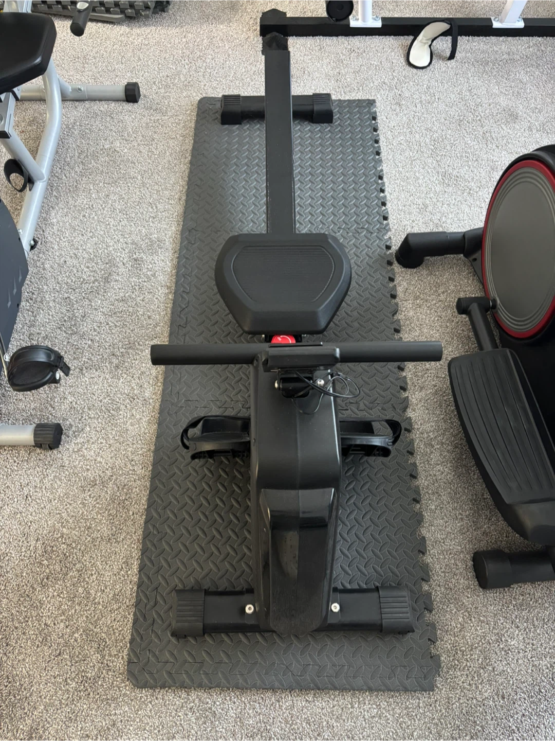 This is a rowing machine for home workouts. It's designed for a smooth and effective exercise experience. Comes with adjustable foot straps for secure placement.