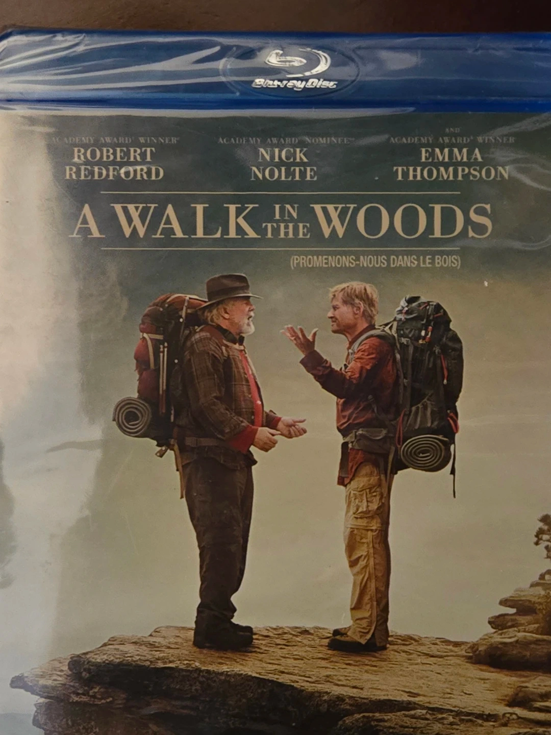 A Walk in the Woods on Blu-ray disc. It stars Robert Redford, Nick Nolte, and Emma Thompson. This movie follows two friends on a trek along the Appalachian Trail.