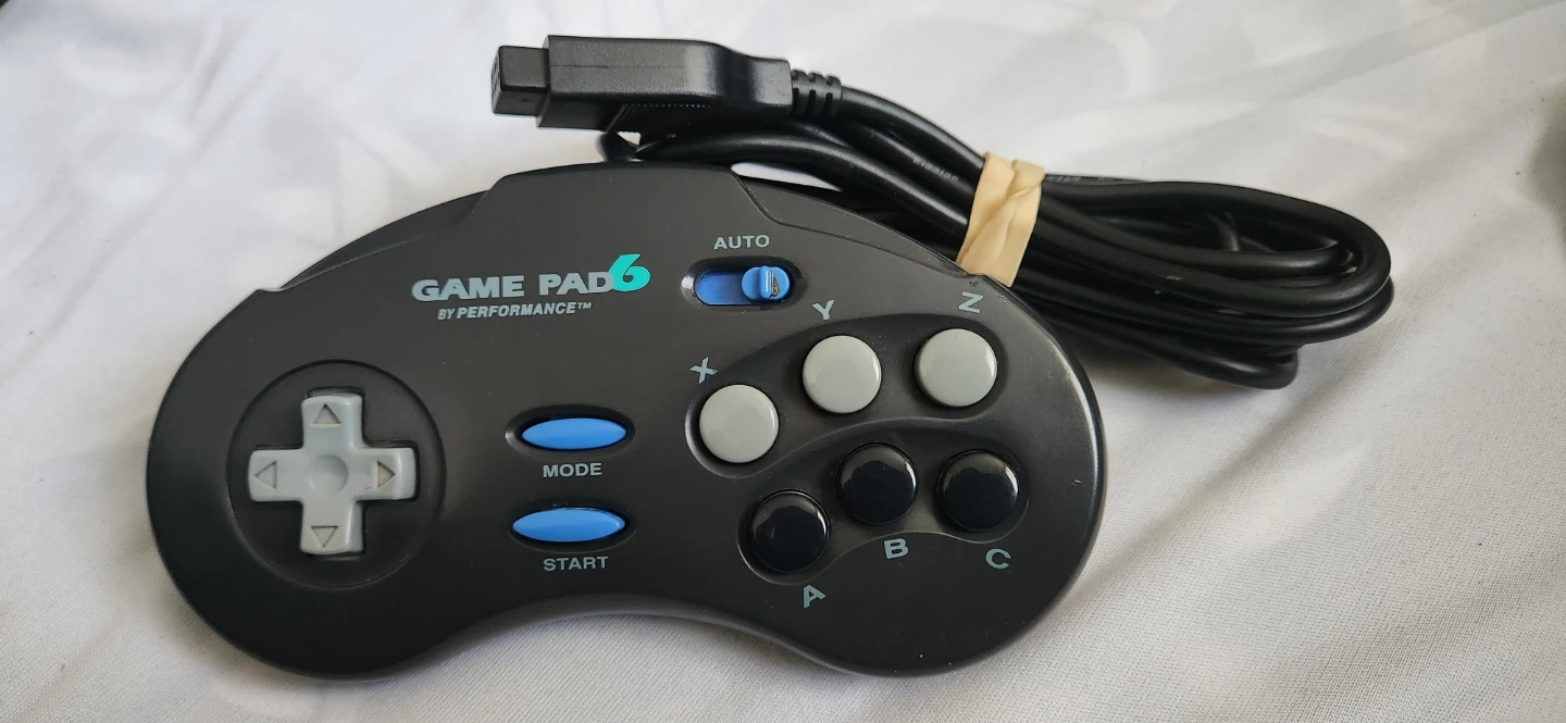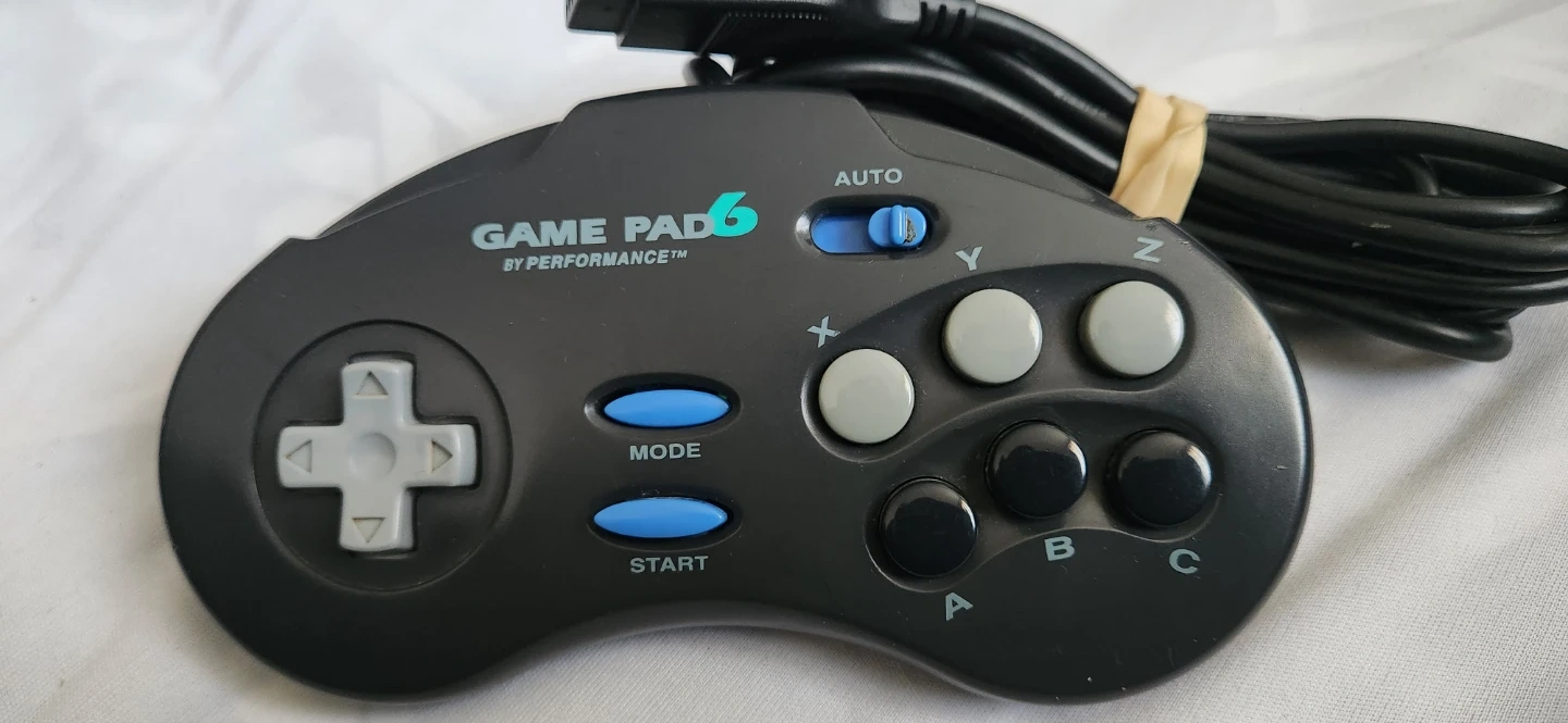This is a black "Game Pad 6" controller by Performance. It features a directional pad, six action buttons, and a start button. This controller is designed for Sega Genesis systems.