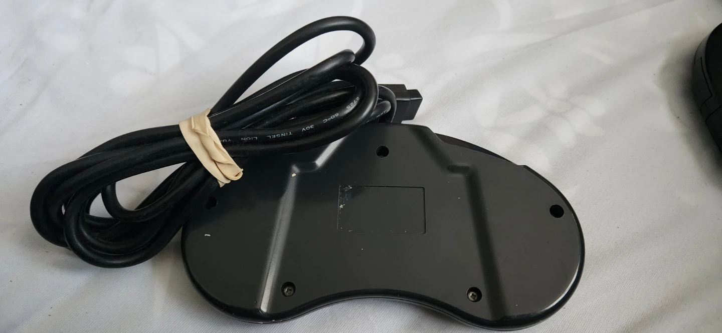 This is a black "Game Pad 6" controller by Performance. It features a directional pad, six action buttons, and a start button. This controller is designed for Sega Genesis systems.