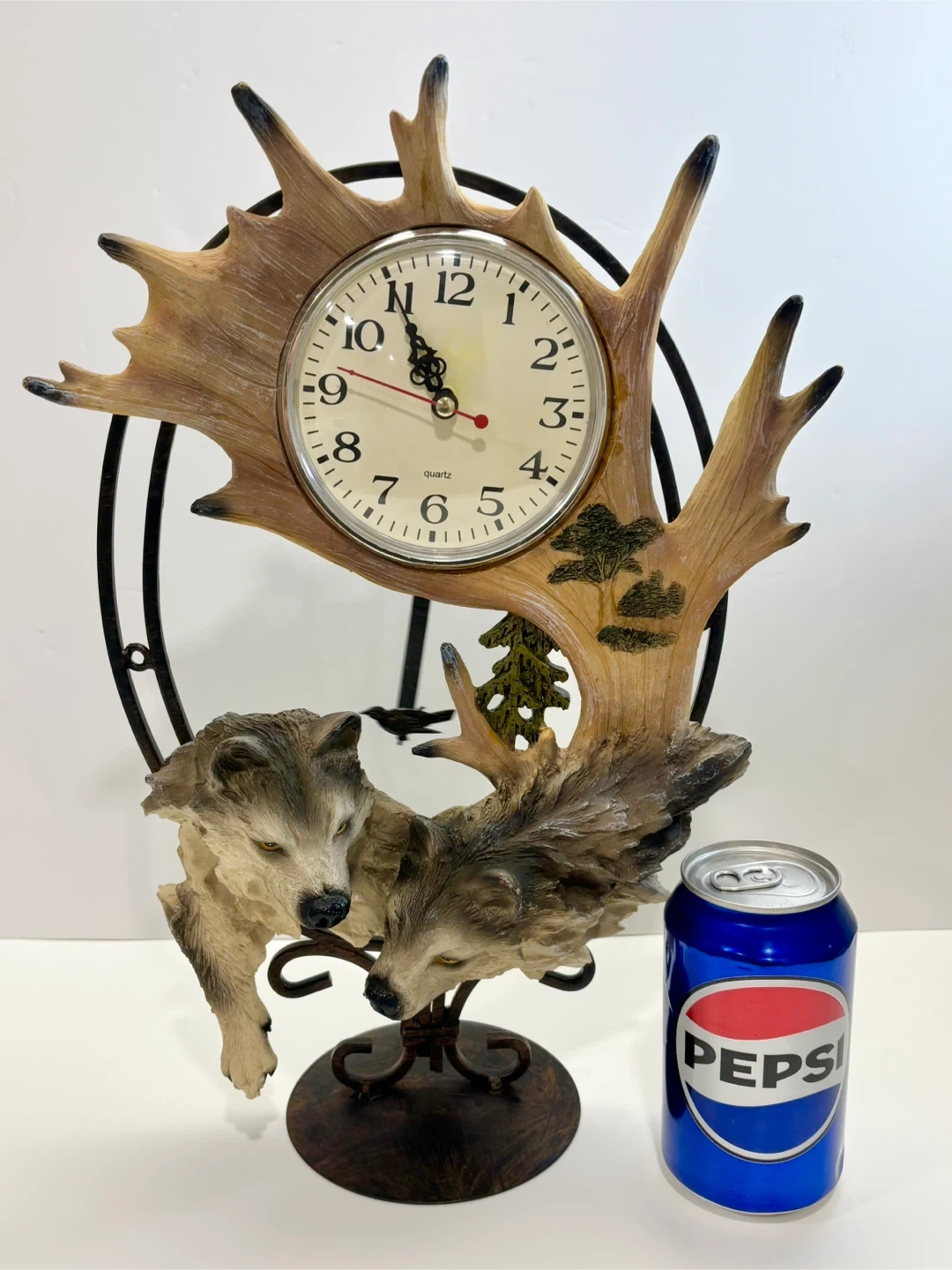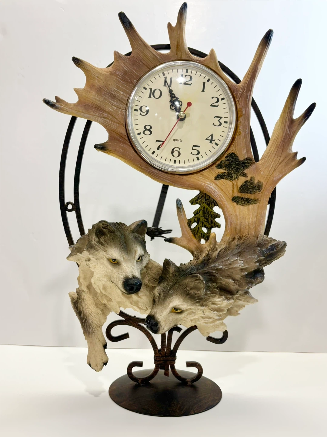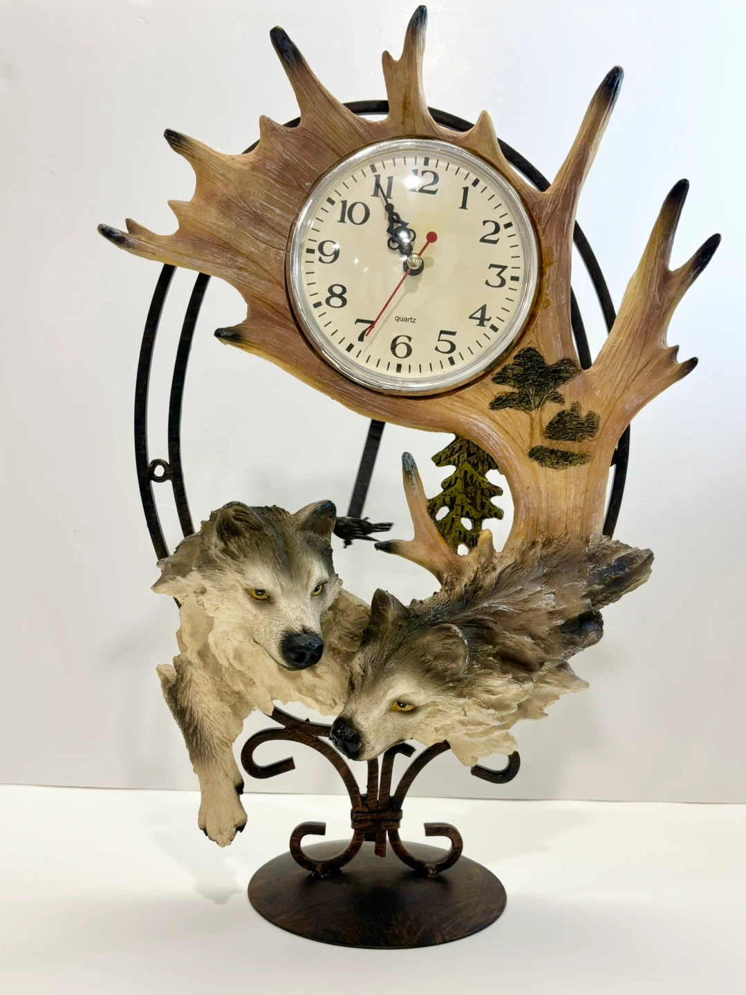 108Very Unique table clock featuring a wolf and antler design with a moving blackbird in the background . It's a quartz clock and would make a great addition to any room or collector . New battery included .