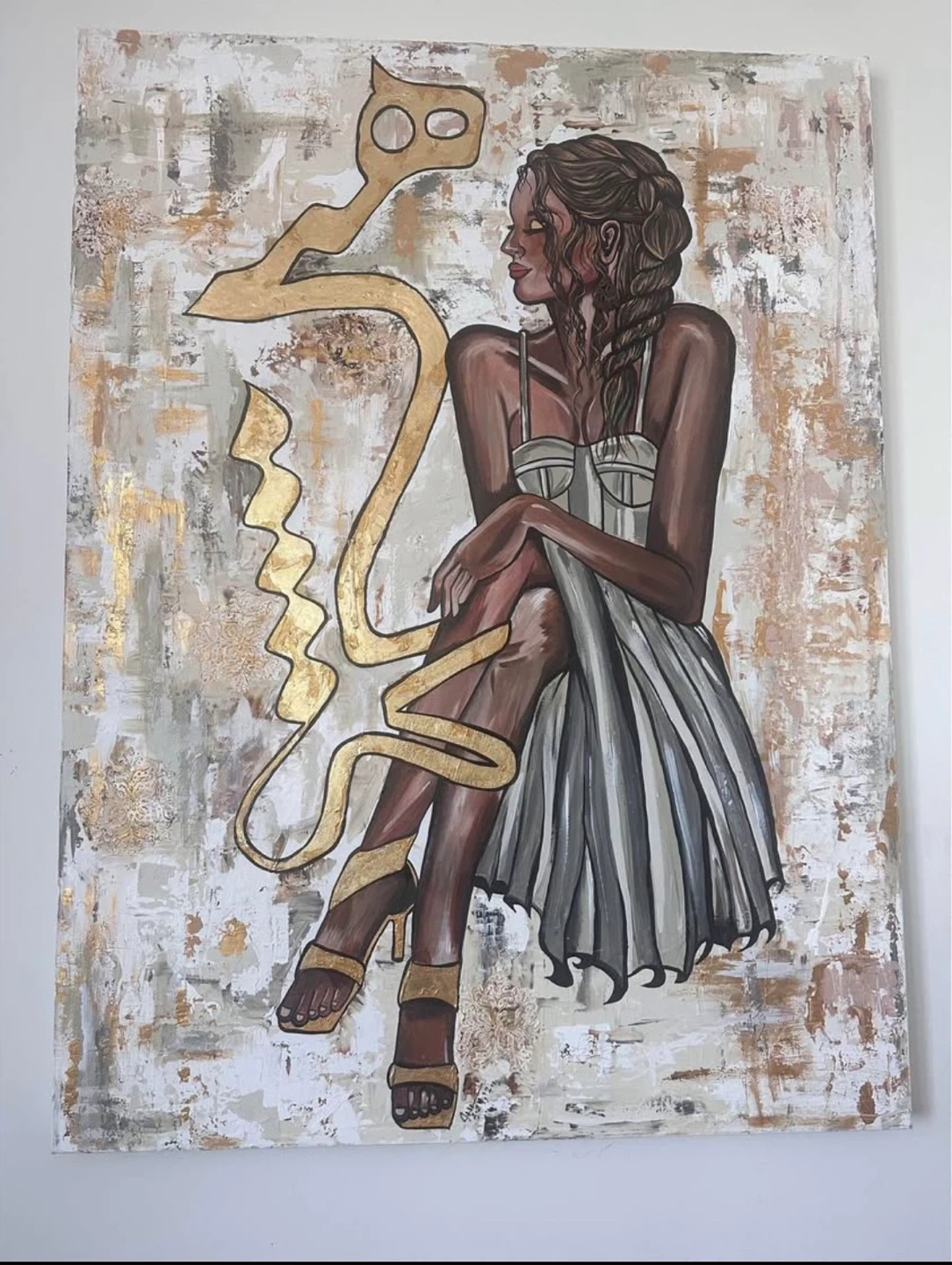 15This original acrylic painting on canvas captures the quiet strength and grace of a woman in a moment of reflection. Textured layers of white, gold, and earthy tones blend with bold abstract lines to create a sense of balance between emotion and structure. The artwork’s modern composition and warm palette make it a striking piece for any living room, studio, or gallery wall.