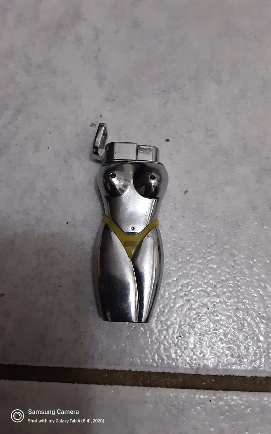 1000+Selling a unique lighter shaped like a woman's body. It's silver with a yellow accent. A fun and quirky piece!