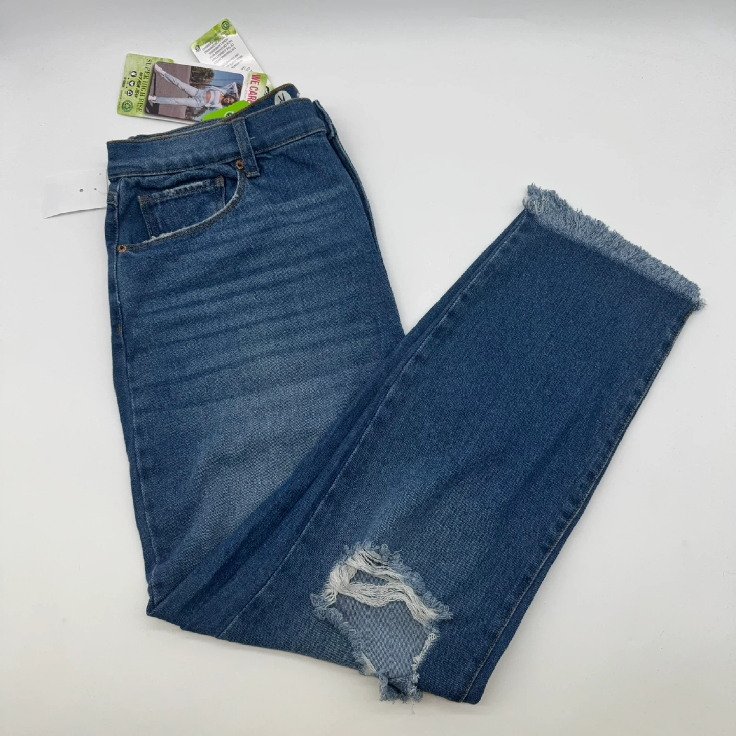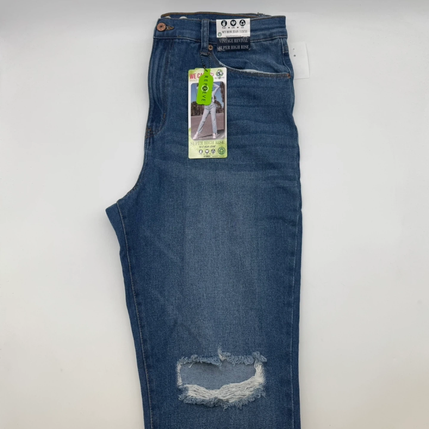Stylish and comfortable 90's Mom Jeans with a super high-rise fit, made with recycled fibers. Features light distressing on the front and a raw hem for a trendy look. • Condition: New with tags • Material: • Front: 100% Cotton • Back: 66% Cotton, 30% Repreve® Recycled Polyester, 3% Rayon, 1% Spandex • Fit: Super High Rise • Style: Vintage Revival • Made in: Bangladesh • Size: • US: 13 • Waist: 31 in (approx. EU 42 / UK 16) Eco-friendly fabric Classic light-blue wash Distressed knee details & raw edge hem Pickup in North York Delivery available for extra CLJ41