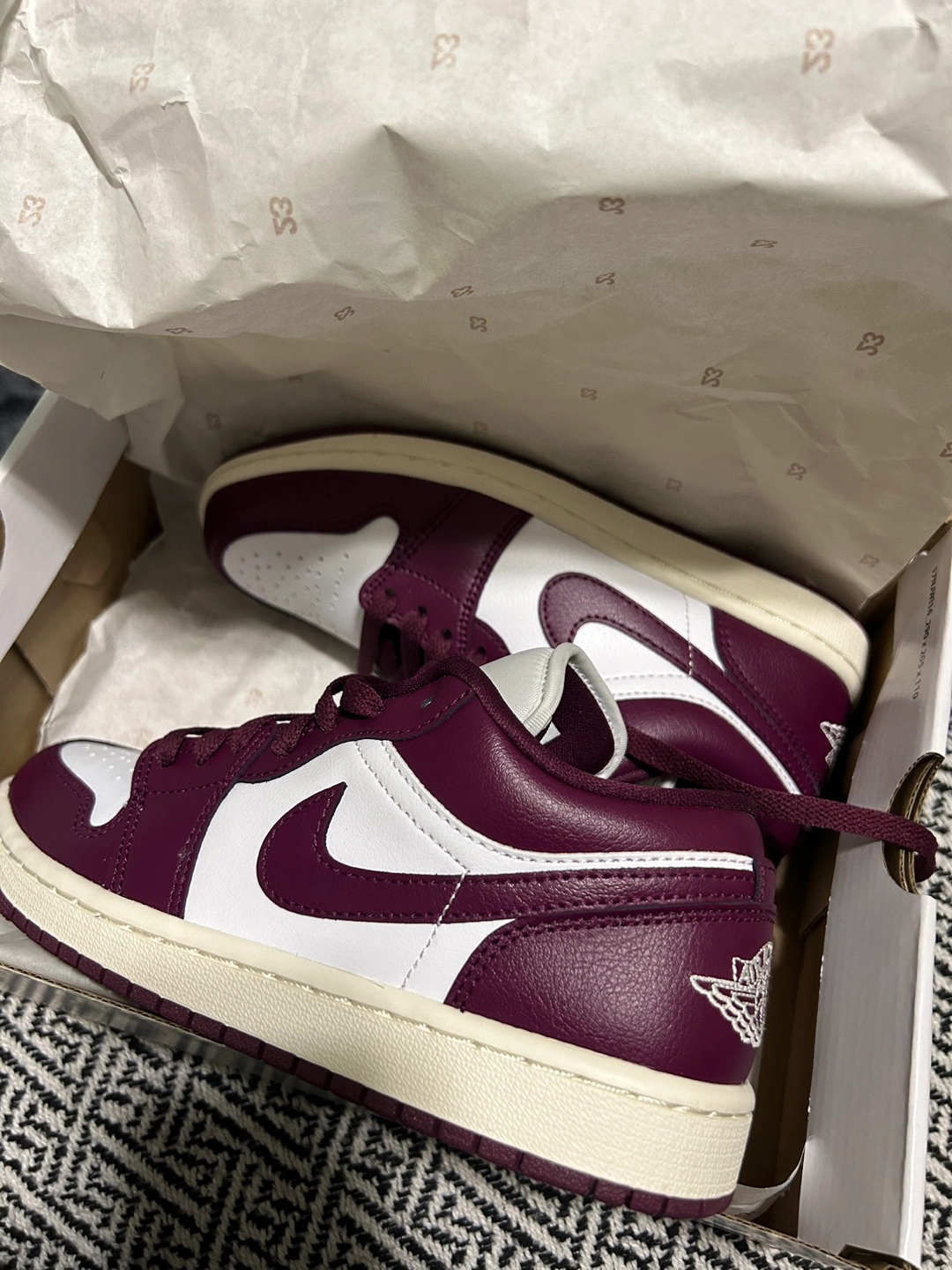 135Brand new women's Air Jordan 1 Low. Size US 6.5. Burgundy and white colourway. Comes in original box. Never used, completely new!