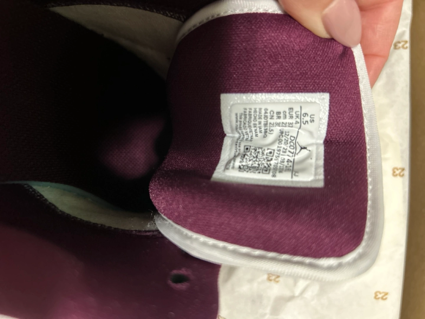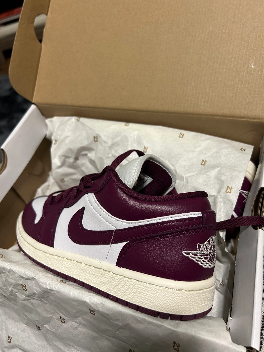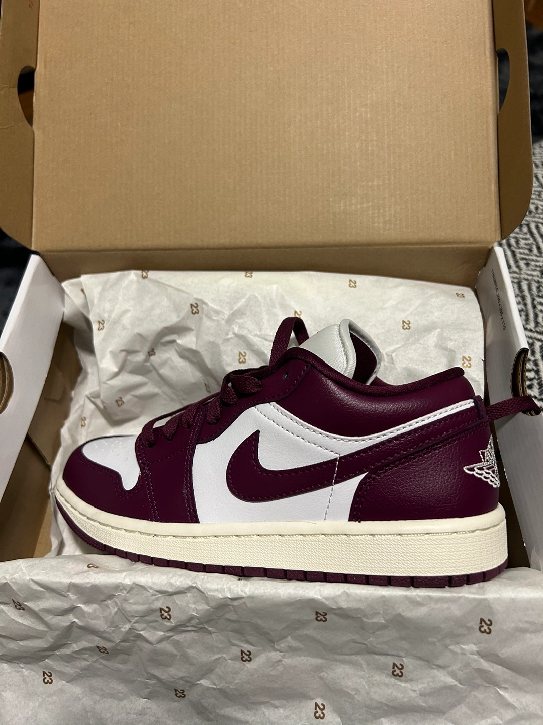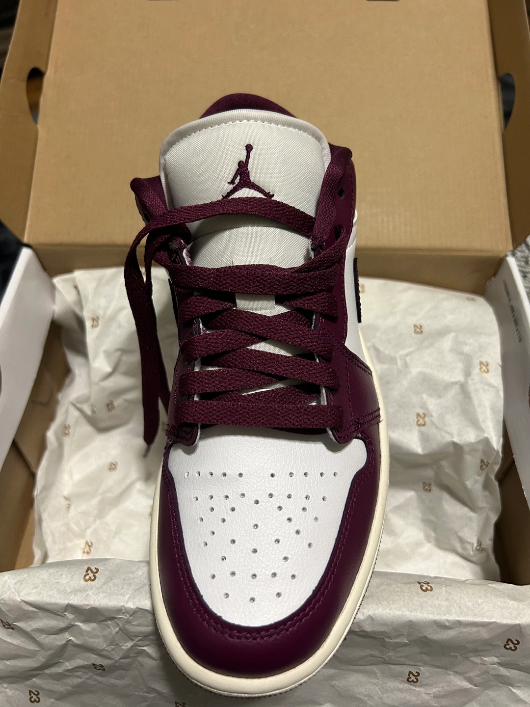 135Brand new women's Air Jordan 1 Low. Size US 6.5. Burgundy and white colourway. Comes in original box. Never used, completely new!