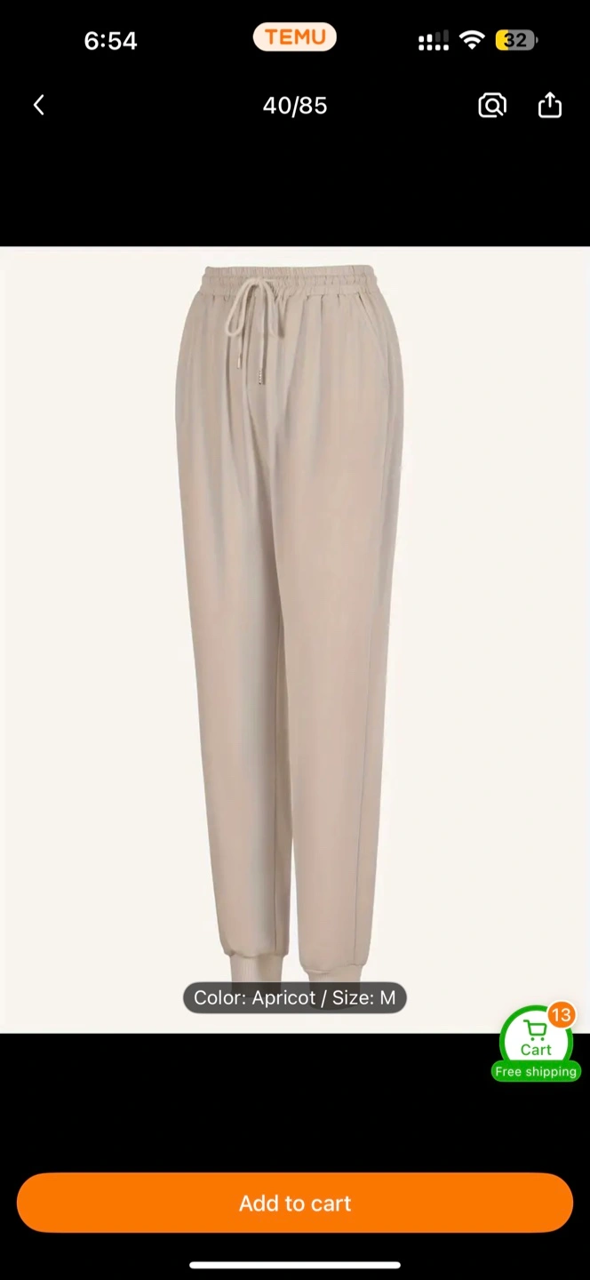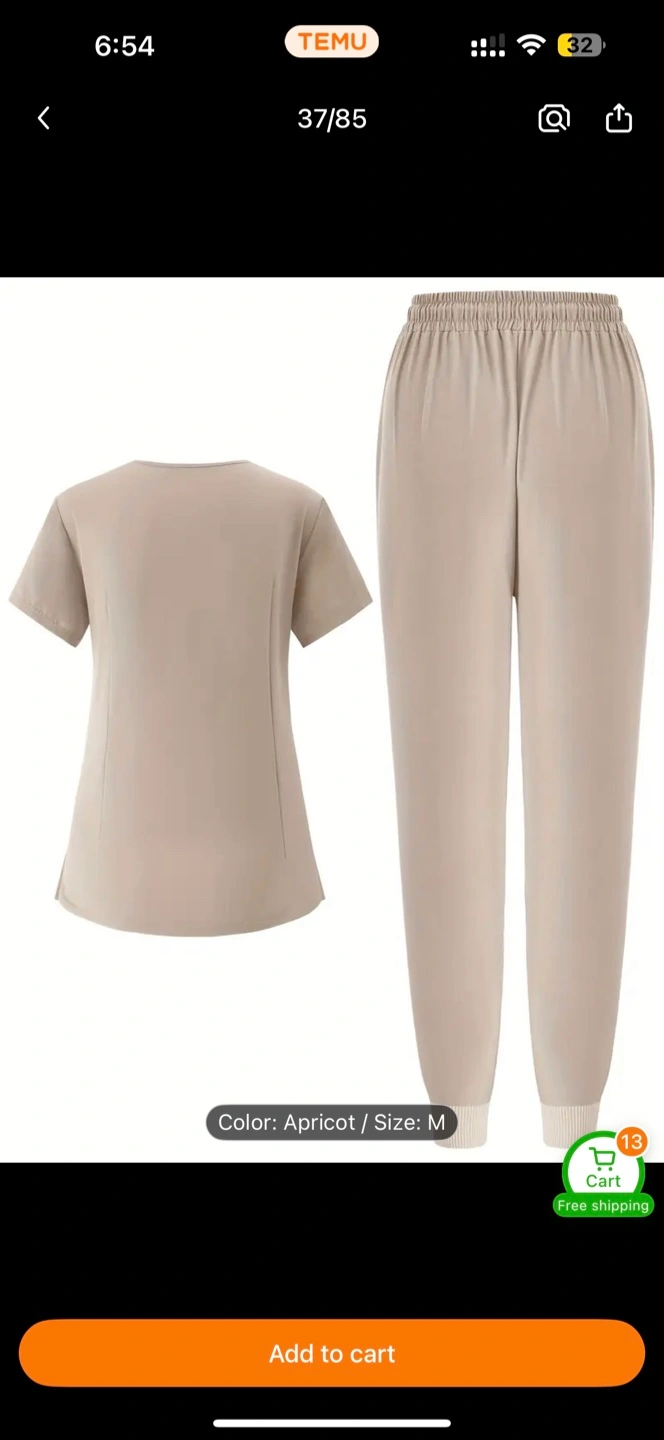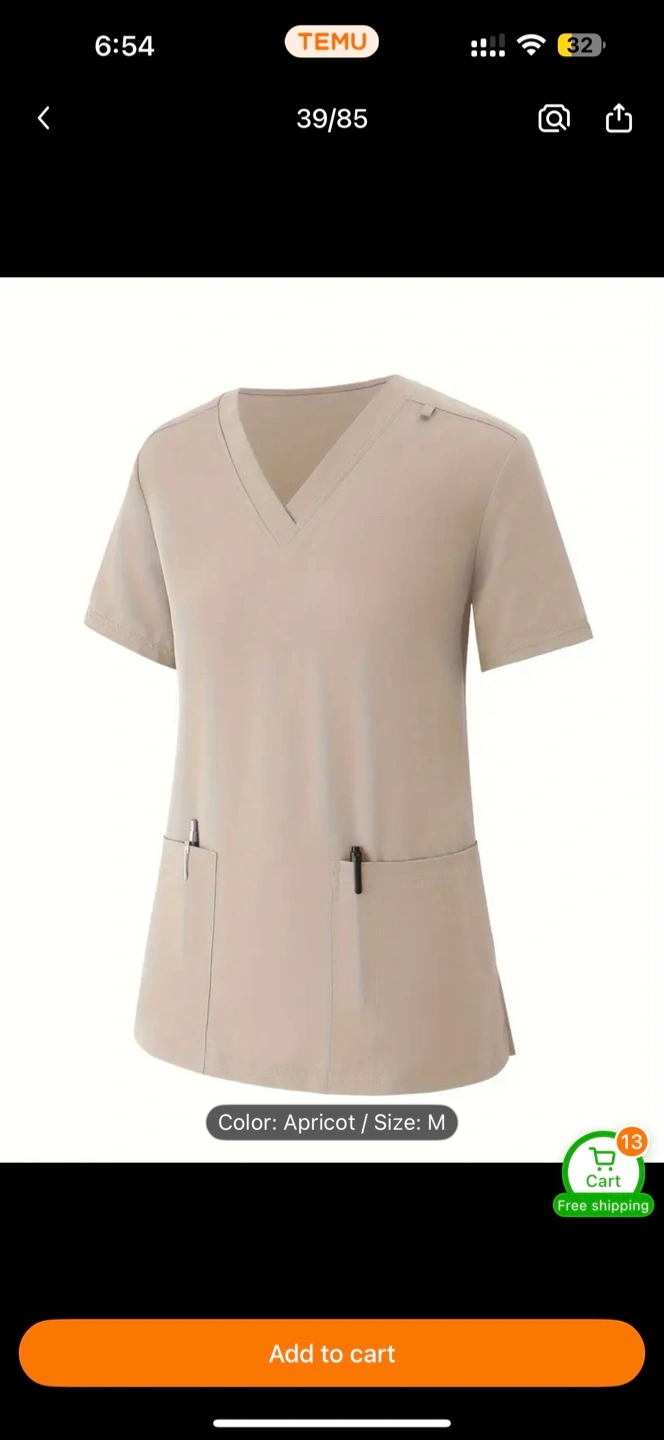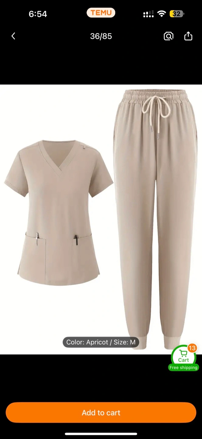 Two-piece scrub set. Includes top and pants. Apricot colour. Size Medium. Short sleeves. V-neck top. Elastic waistband pants. Drawstring closure.