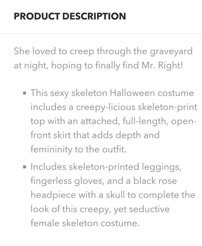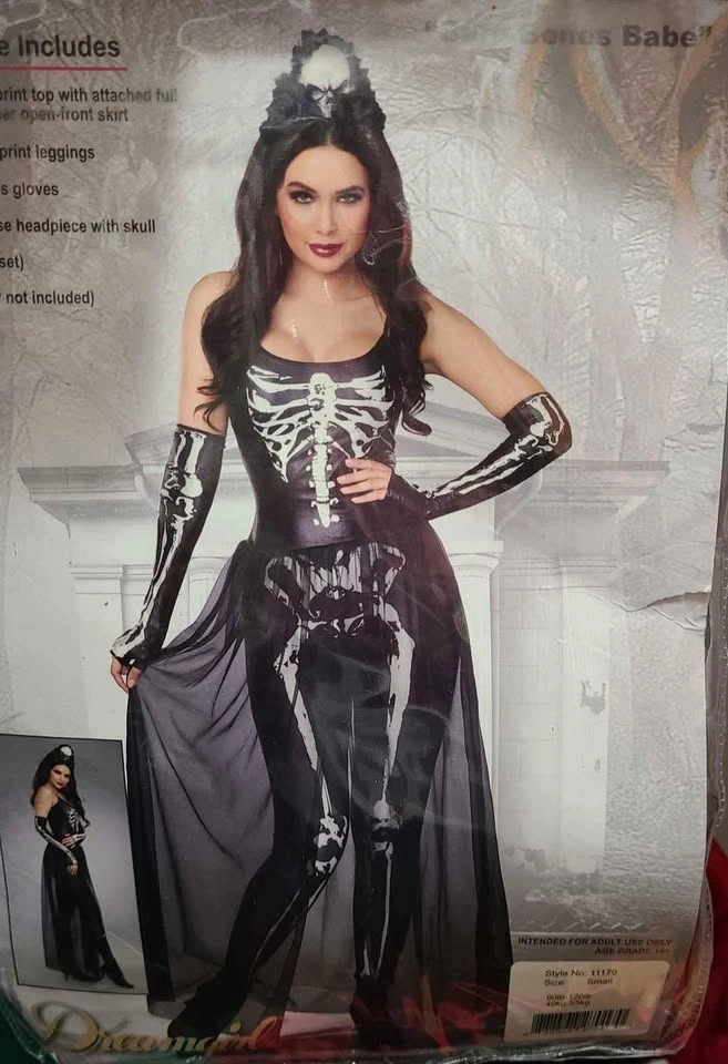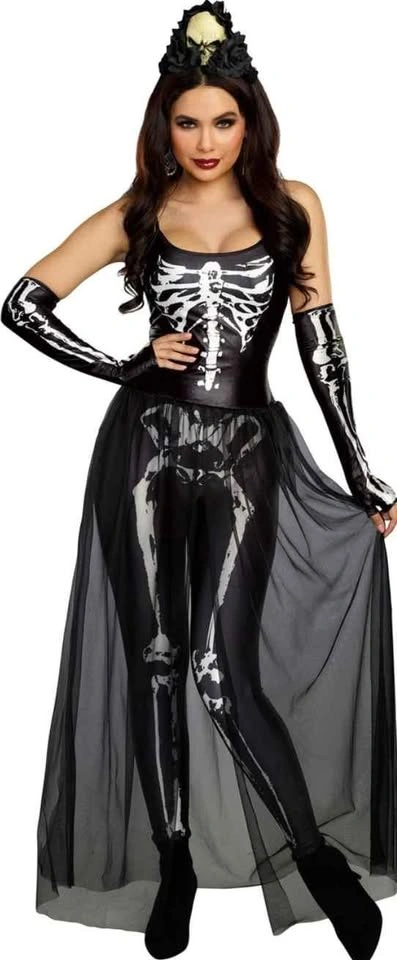 Due to so many scams I'm only accepting cash at the moment thank you. She loved to creep through the graveyard at night, hoping to finally find Mr. Right! This sexy skeleton Halloween costume includes a creepy-licious skeleton-print top with an attached, full-length, open-front skirt that adds depth and femininity to the outfit. Includes skeleton-printed leggings, fingerless gloves, and a black rose headpiece with a skull to complete the look of this creepy, yet seductive female skeleton costume.