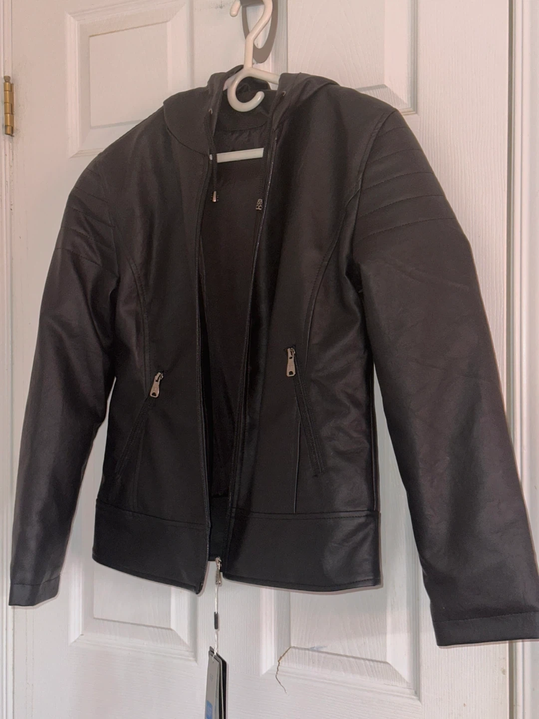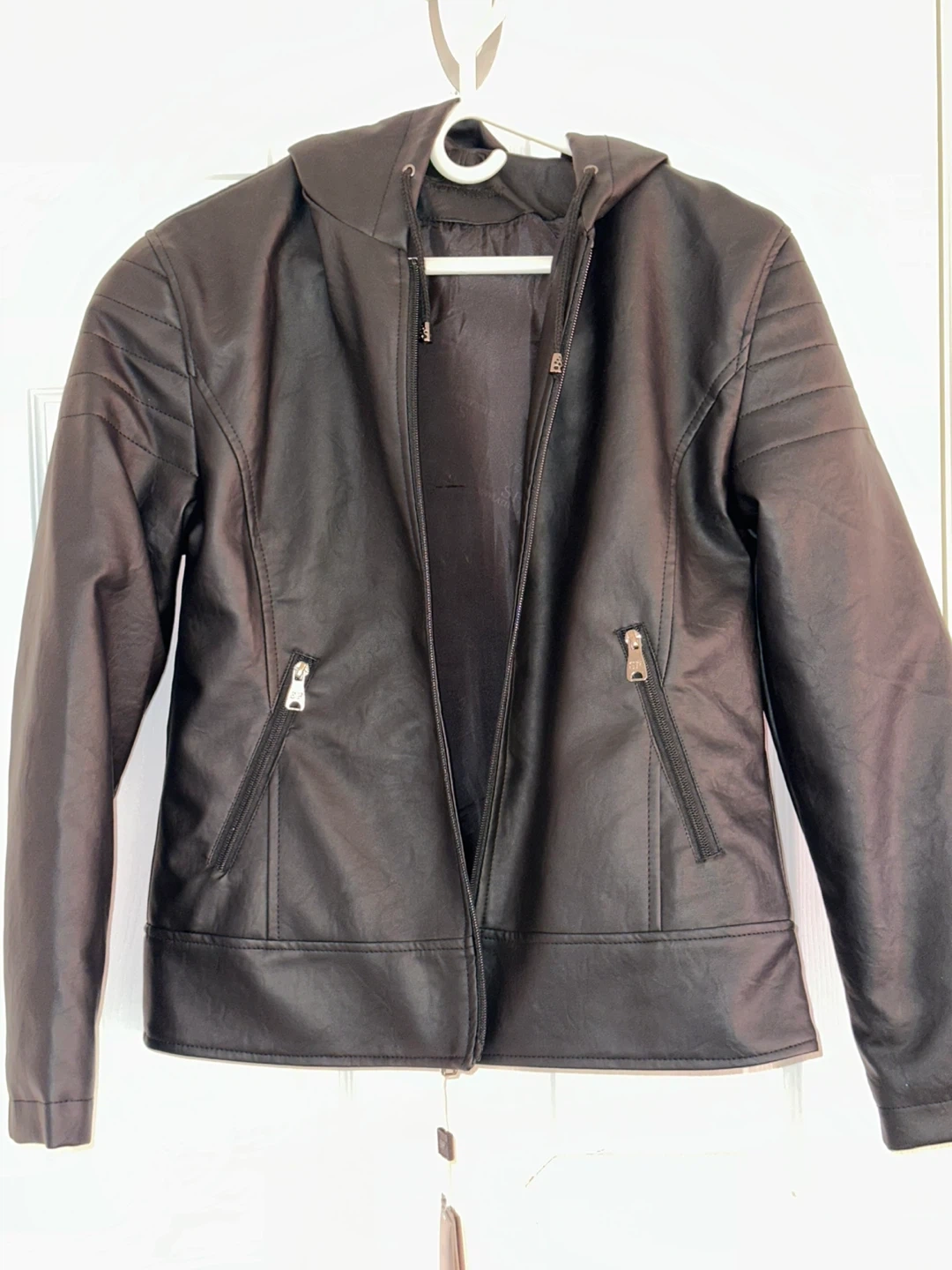 24Selling a stylish black hooded leather jacket from SF. It's in brand new condition with tags. Made in Italy. $450, fcfs Women’s Size Small-Medium