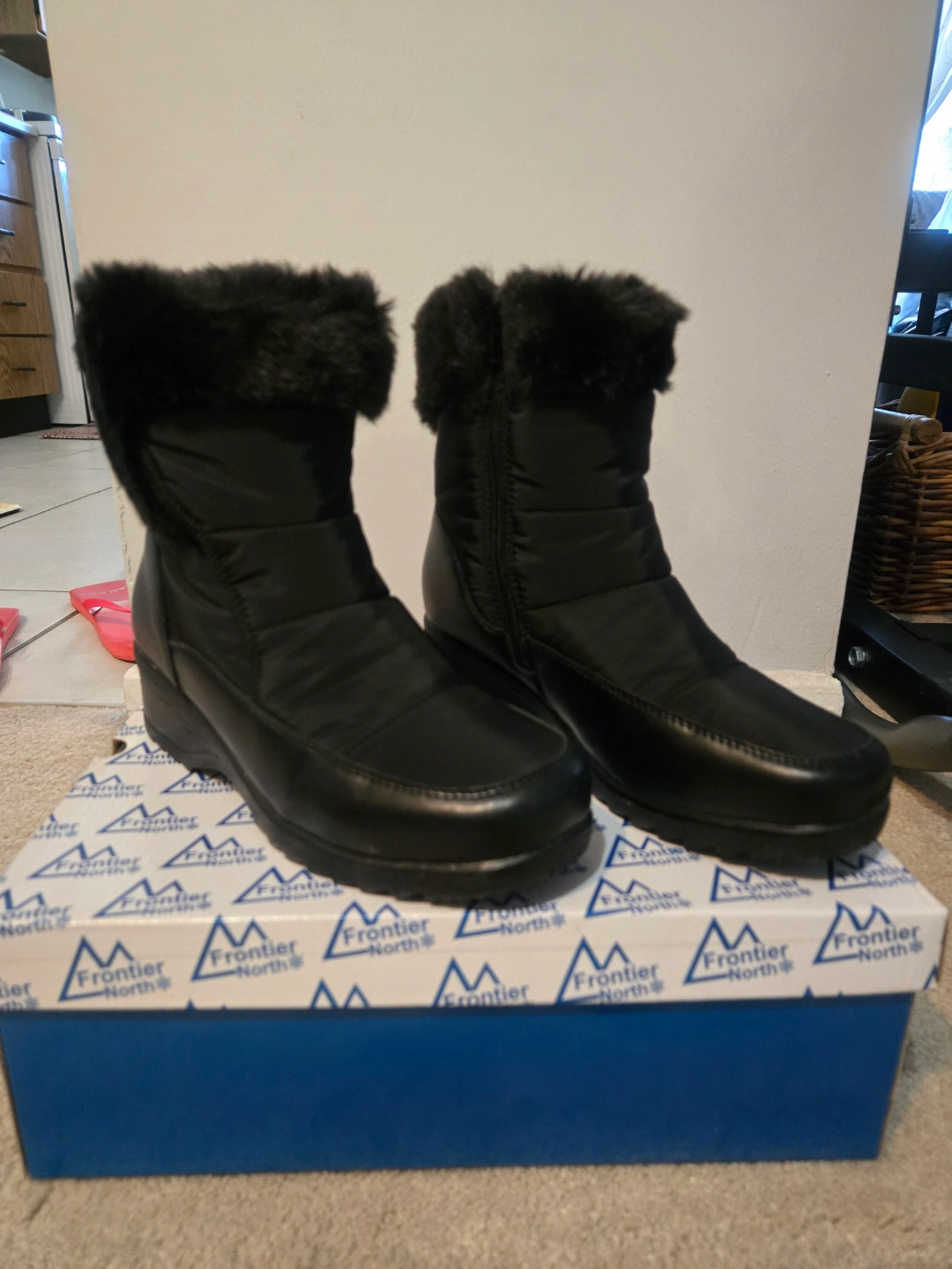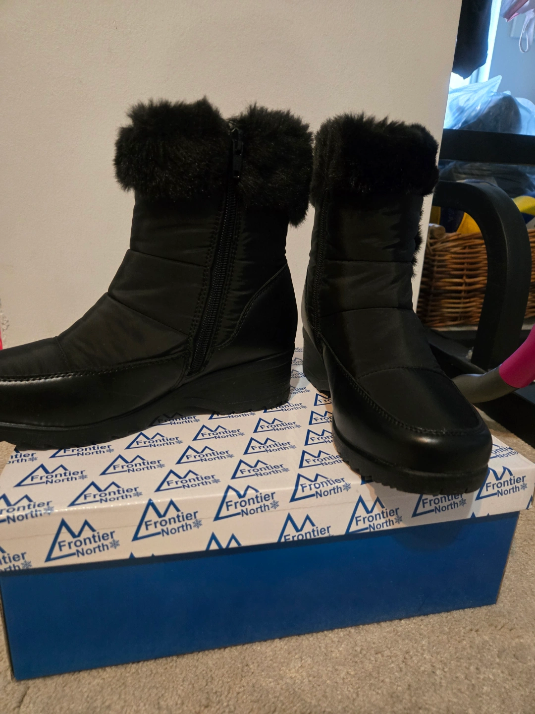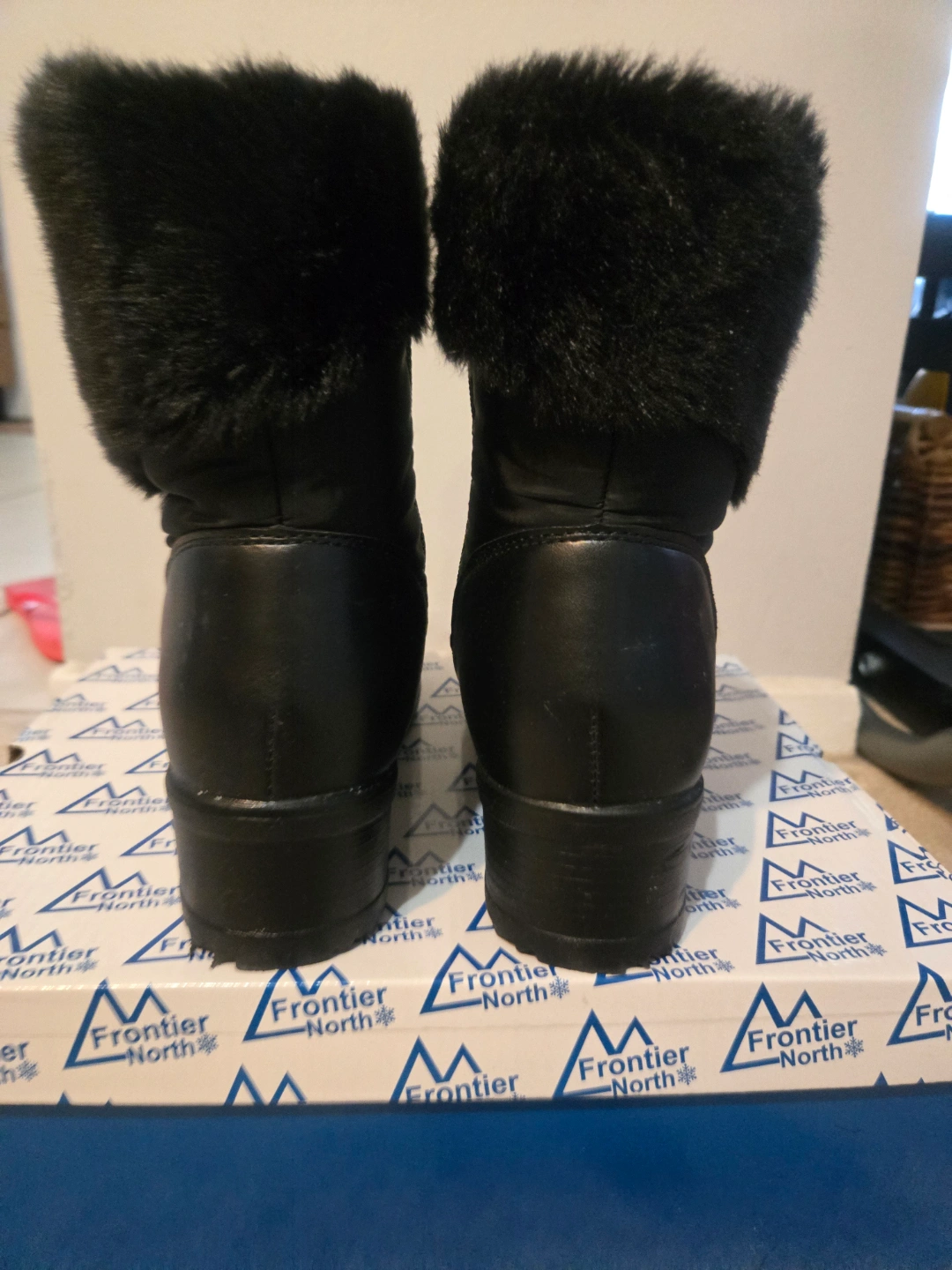 Black winter boots. Faux fur trim. Zipper closure. Low wedge heel. Size 6, Slightly used