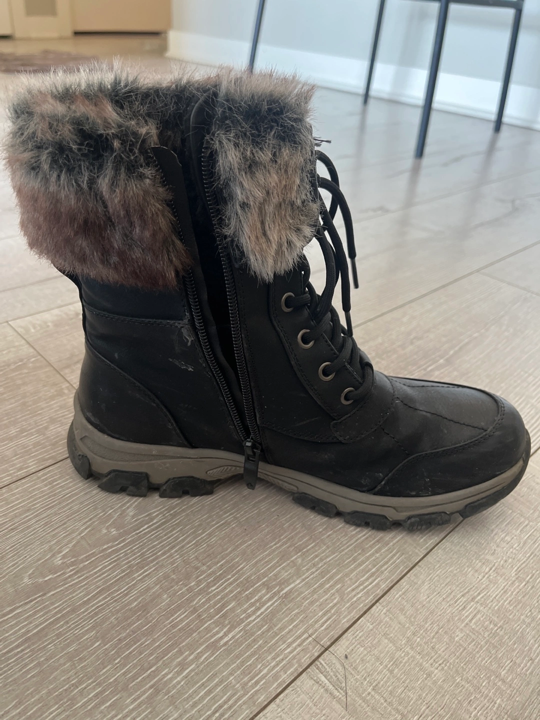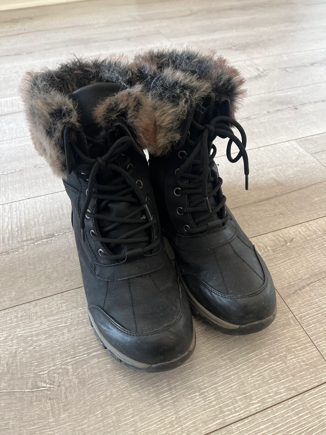 75Lace-up winter boots. Faux fur trim. Side zipper. Good for snow. Size not specified.