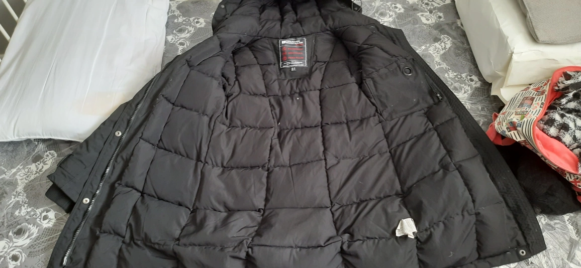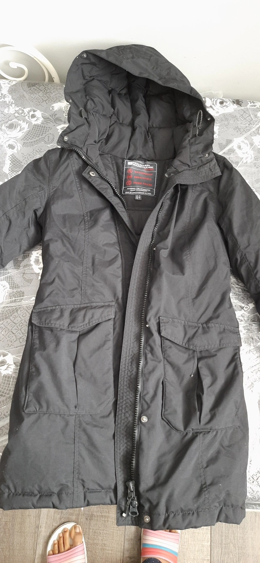 Warm winter parka. Black colour. Size S. Features a hood and pockets. Long sleeves. Zipper and button closure. can bear upto -10°C.