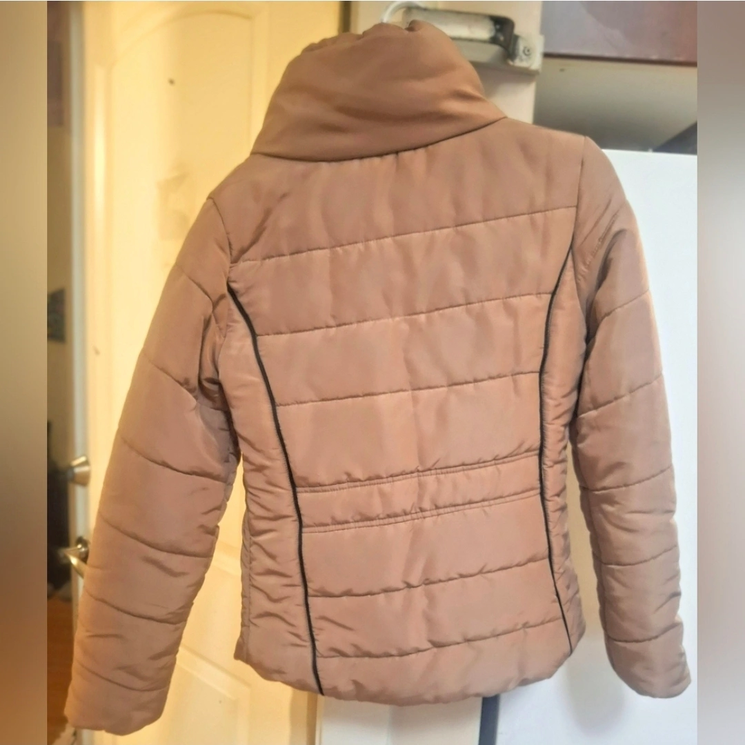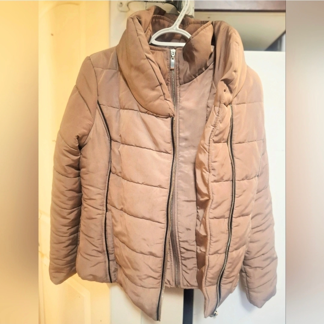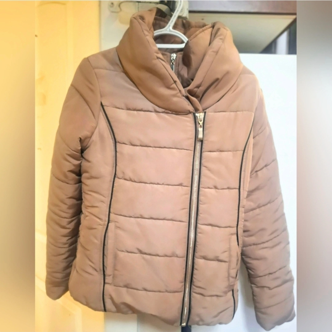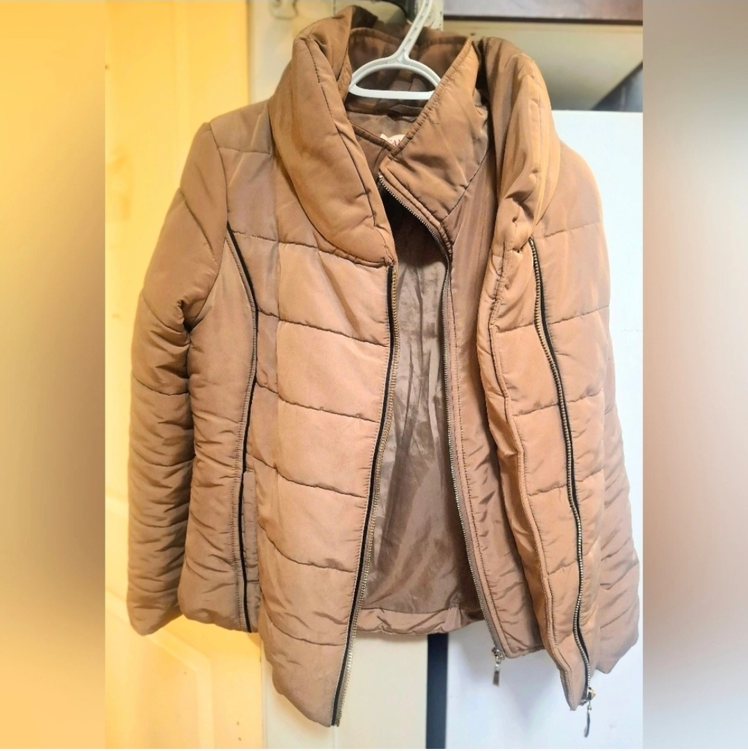 Embrace warmth and style with this cozy brown puffer Jacket from Camaïeu. it's got 2 zippers for a little bit of uniqueness and a modern and classy touch but also adds double the layer to keep you warm, very Ideal for chilly weather. This Puffer jacket is in the color Beige and is a size Small. It's only been worn a couple times so it's in perfect condition. The only thing missing in the price tag!
