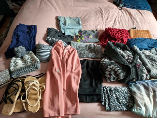 15Mostly size small/fit like smalls. 20 items total. Includes 2 new pairs of sandals (size 6-7), a clutch and a bling purse, Micheal Kors shirt. Smoke free home. Pick up near Lesperance and the Expressway.