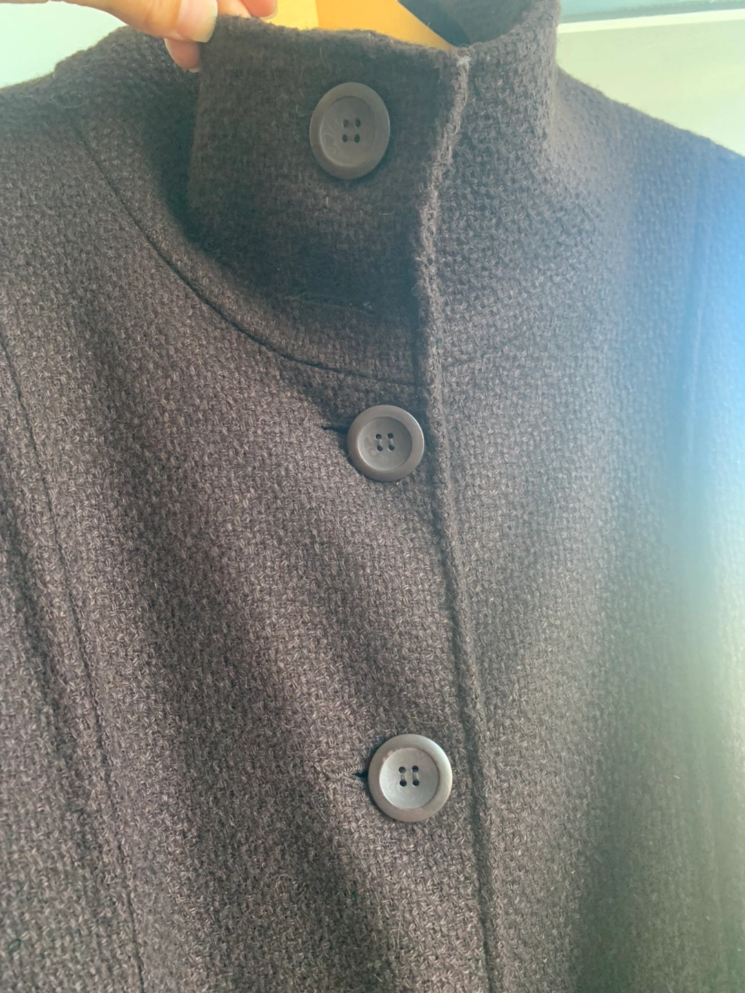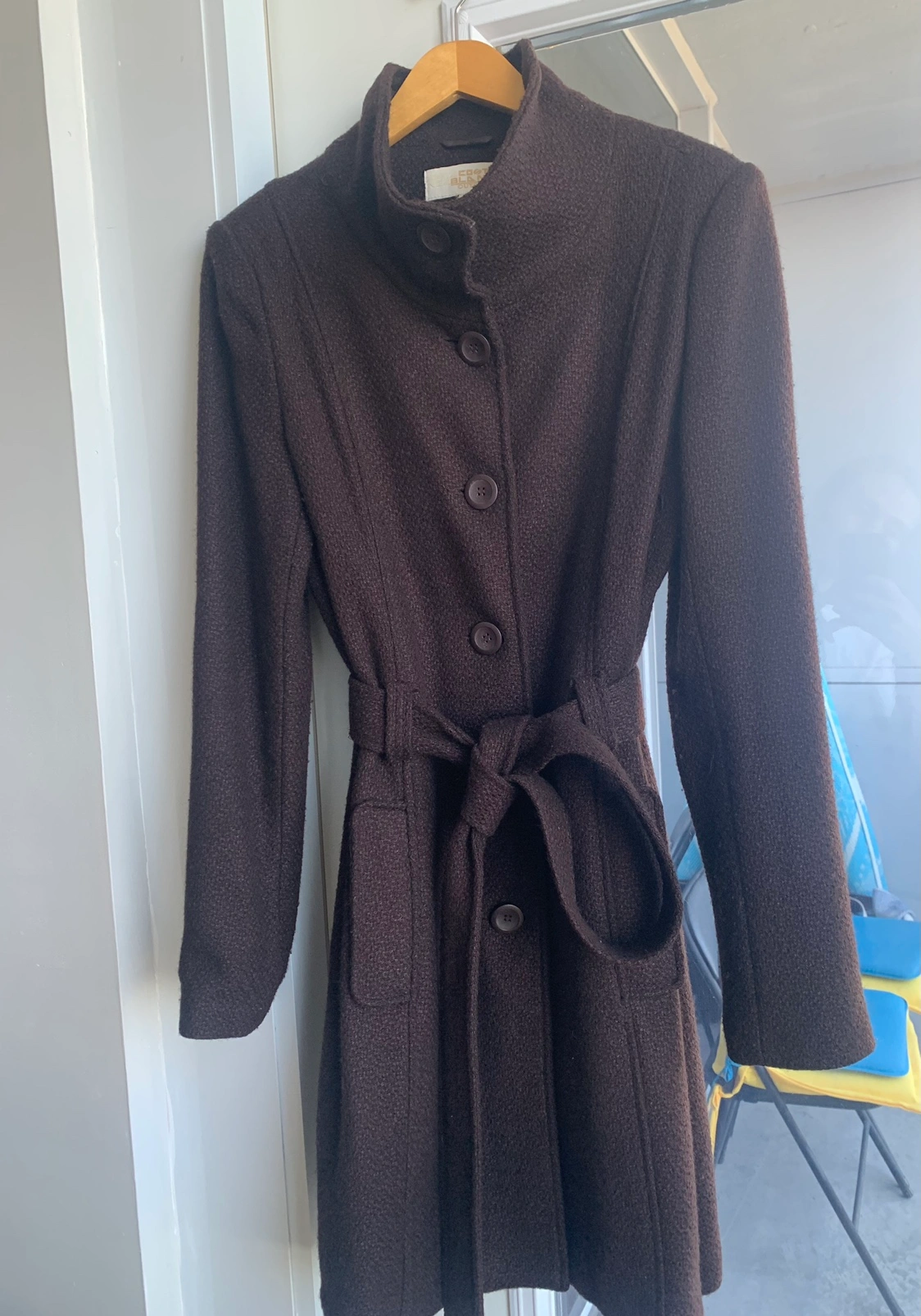 Dark brown button up coat w tie. One button missing near neck as shown in third picture. Lined. Has pockets. Worn a handful of times. Excellent condition. Tag say size Large but fits like a small/medium. Smoke and pet free home.
