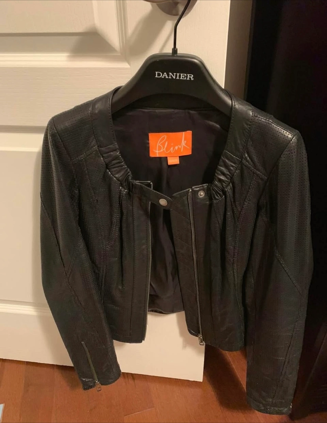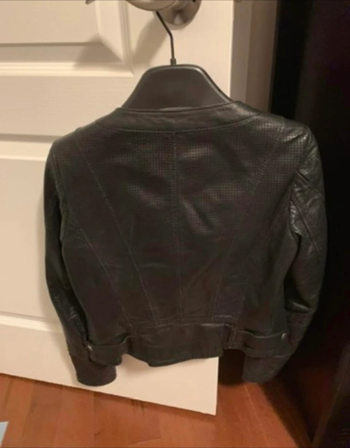 Black leather jacket. Zipper closure. Perforated detailing. Long sleeves.