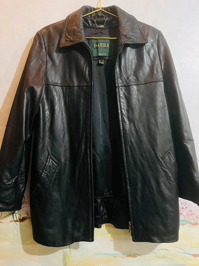 This is a lightly used stylish Danier leather jacket, perfect for adding a touch of class to any outfit. This jacket is in good condition and ready for a new home. It has a timeless design and is made from high-quality leather. Get ready to turn heads with this awesome jacket! Here are some more details: * Brand: Danier * Material: Leather * Colour: Black * Size: L If the ad is up, it's still available.
